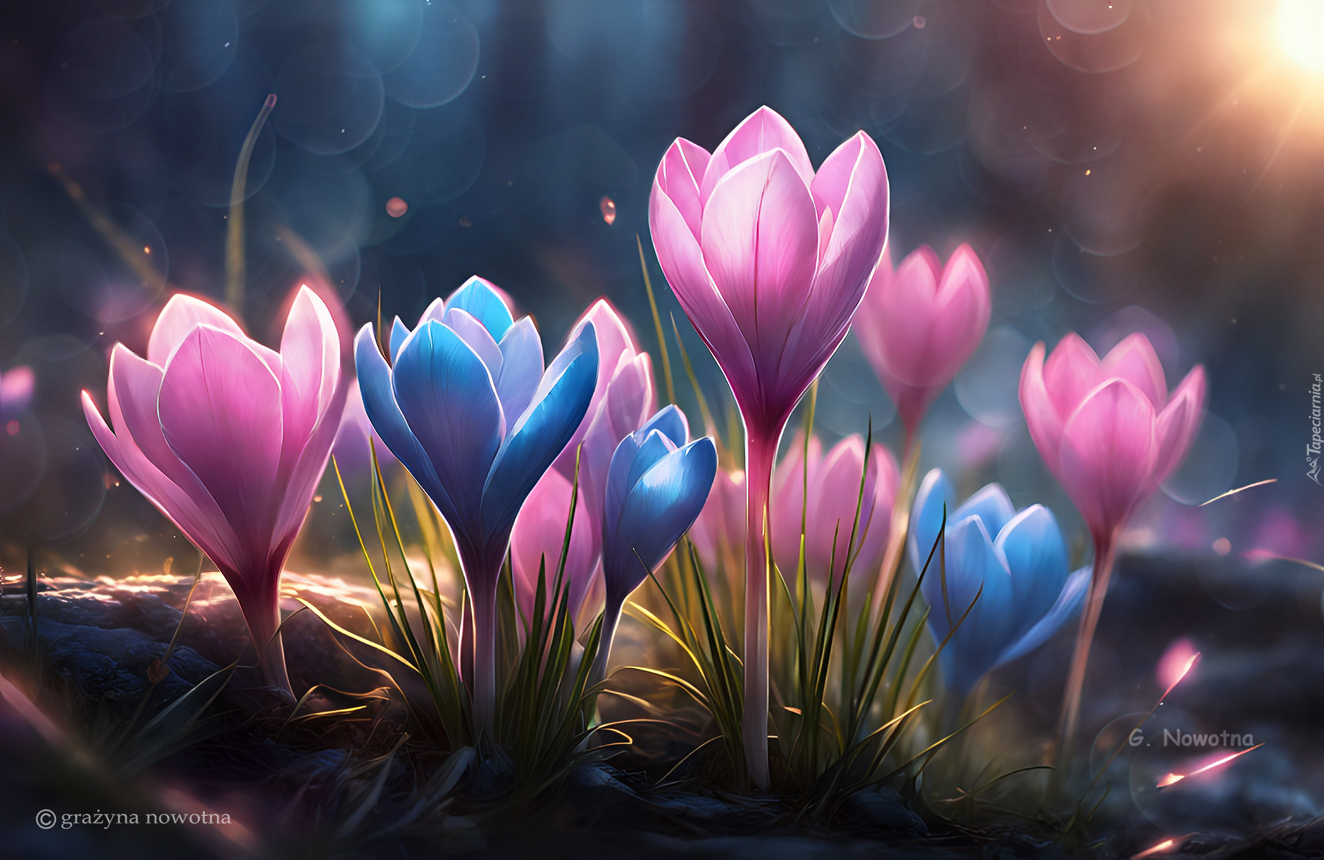 Edytor tapety: Niebieskie i różowe krokusy w blasku światła