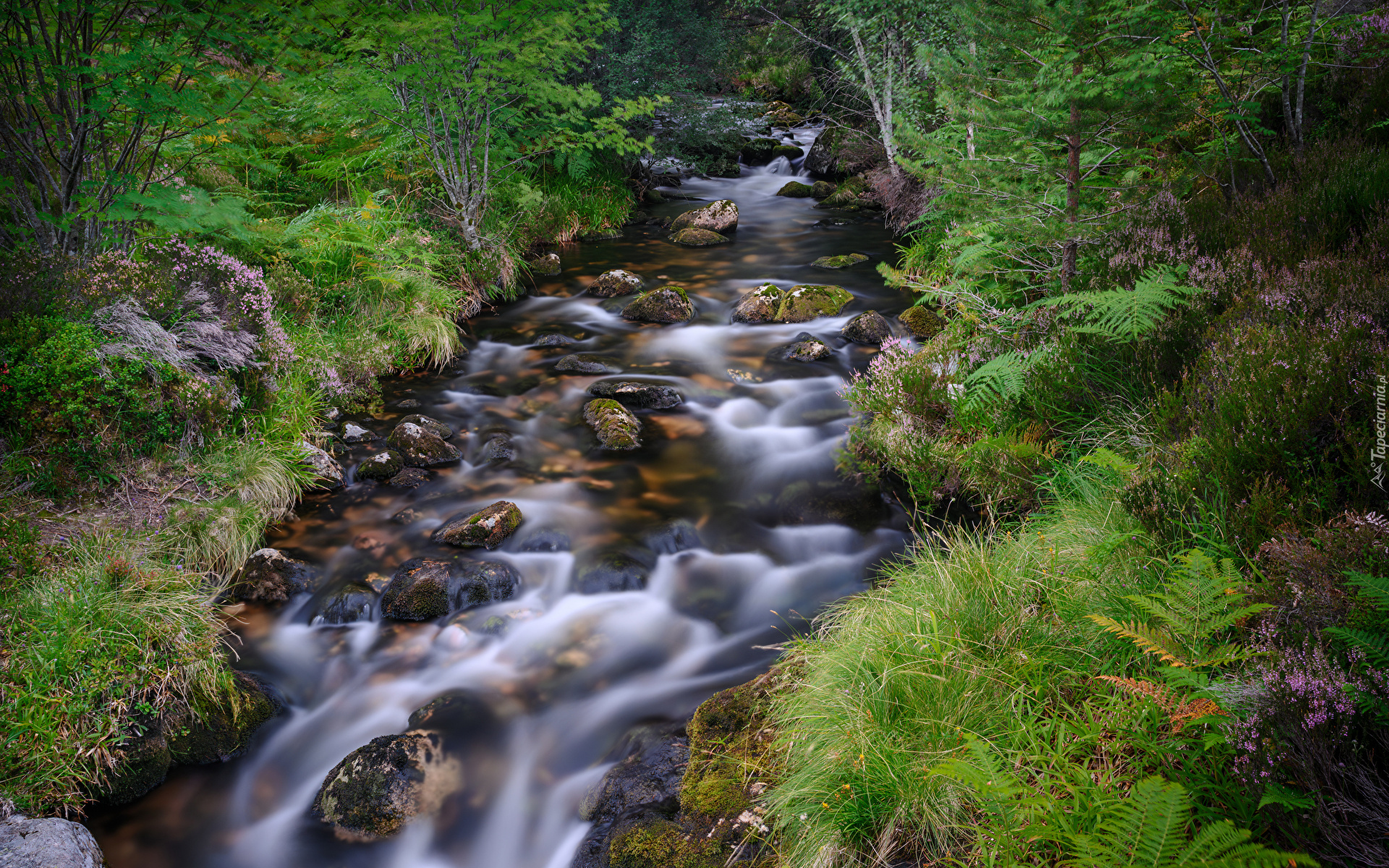 Edytor tapety: Drzewa i paprocie na brzegach kamienistej rzeki