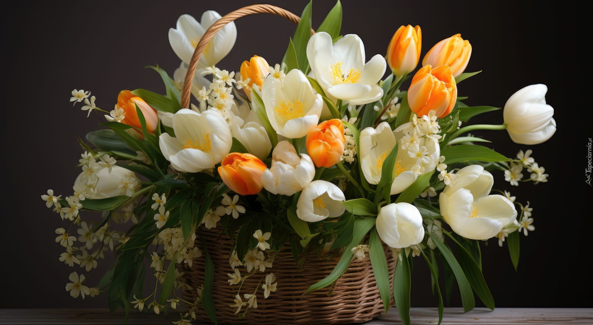Edytor tapety: Białe i pomarańczowe tulipany w koszyku