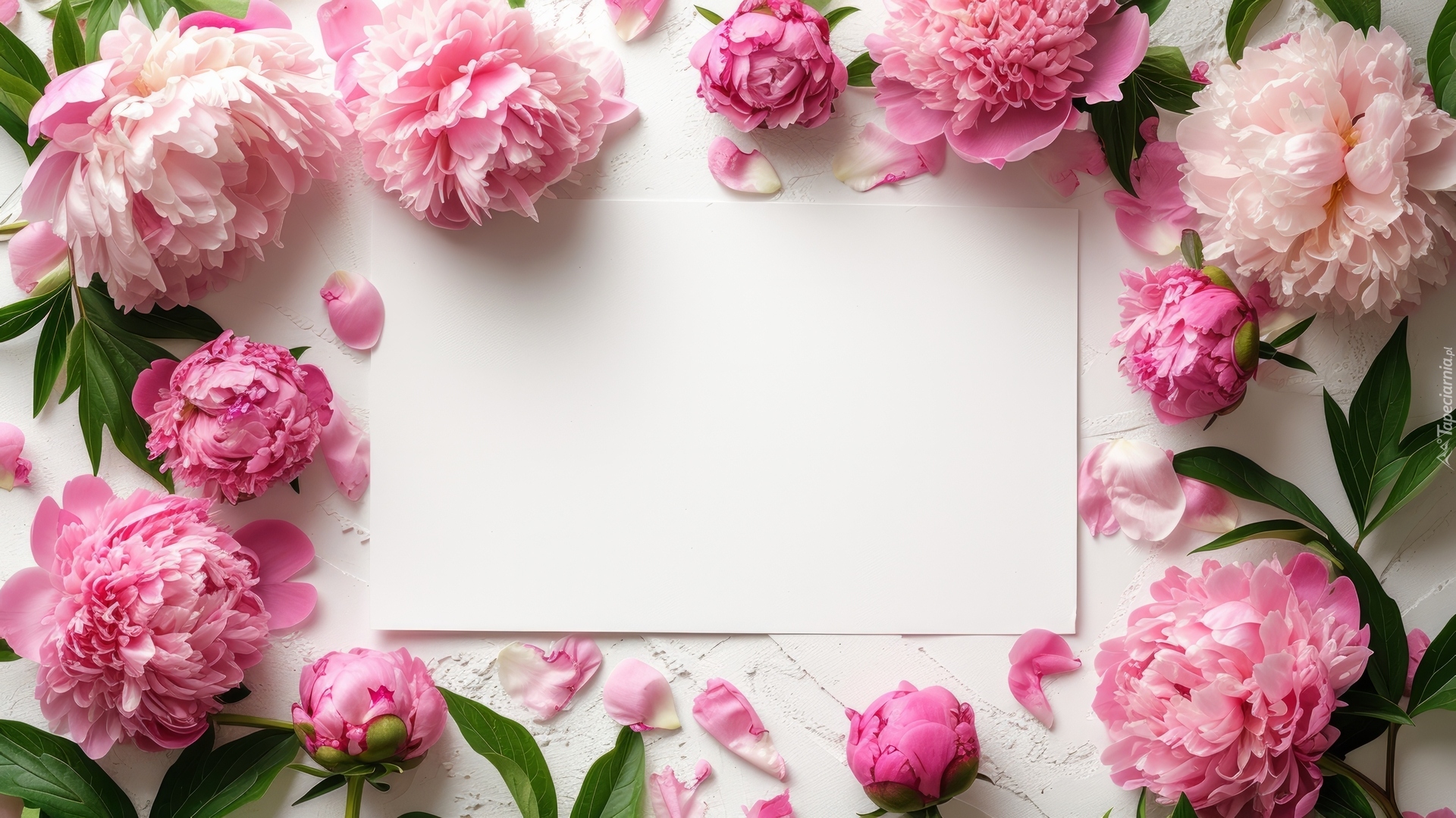 Edytor tapety: Różowe piwonie wokół kartki papieru