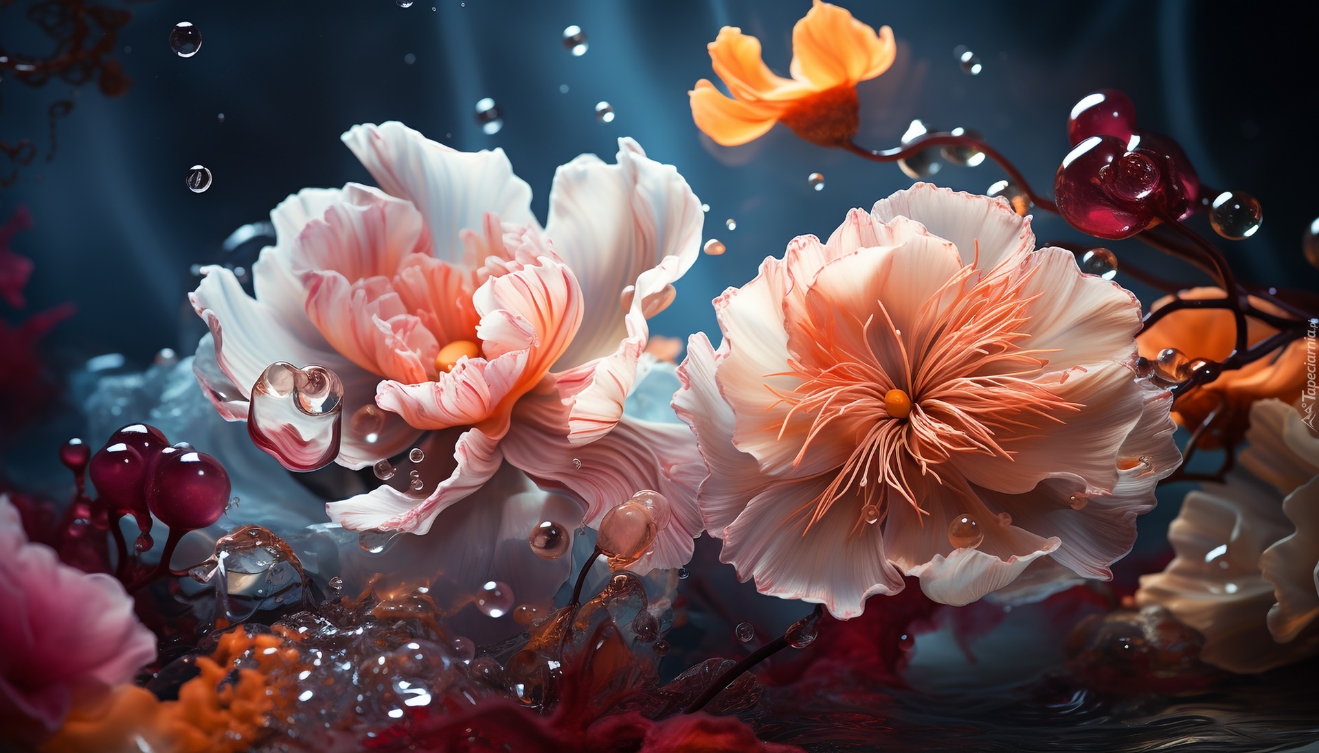 Edytor tapety: Rozwinięte kwiaty i krople wody