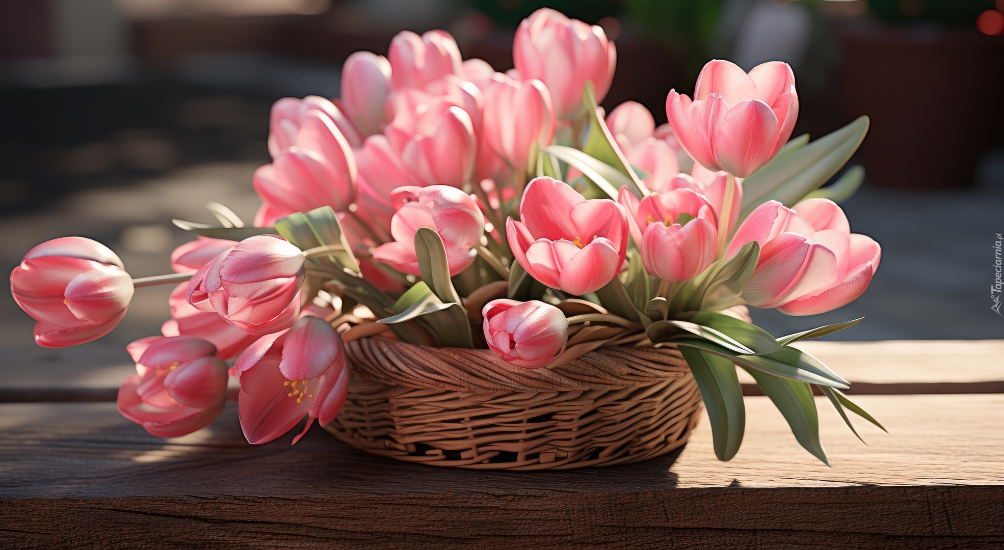 Edytor tapety: Kosz rozświetlonych różowych tulipanów
