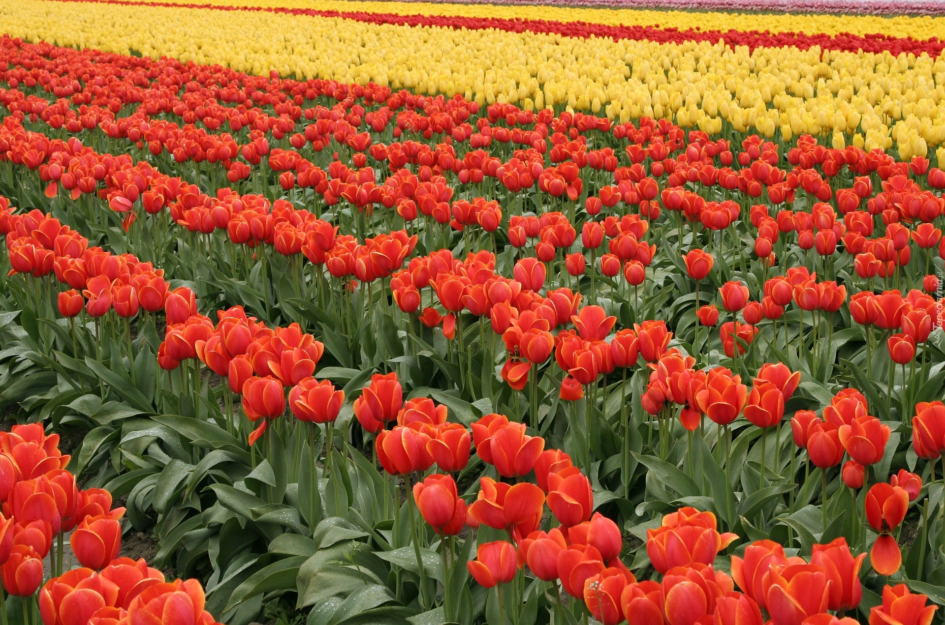 Edytor tapety: Plantacja żółtych i czerwonych tulipanów