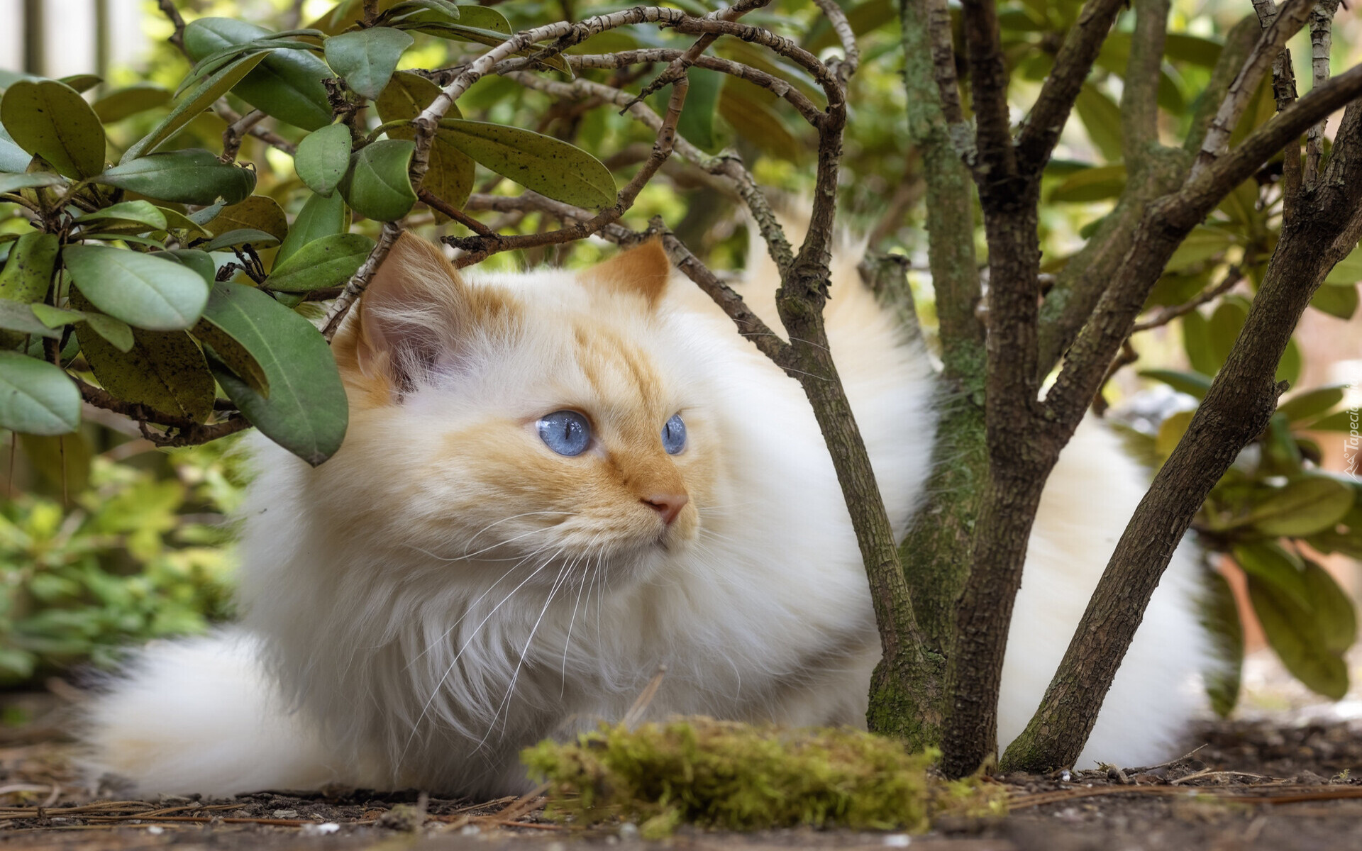Edytor tapety: Niebieskooki kot obok krzewu