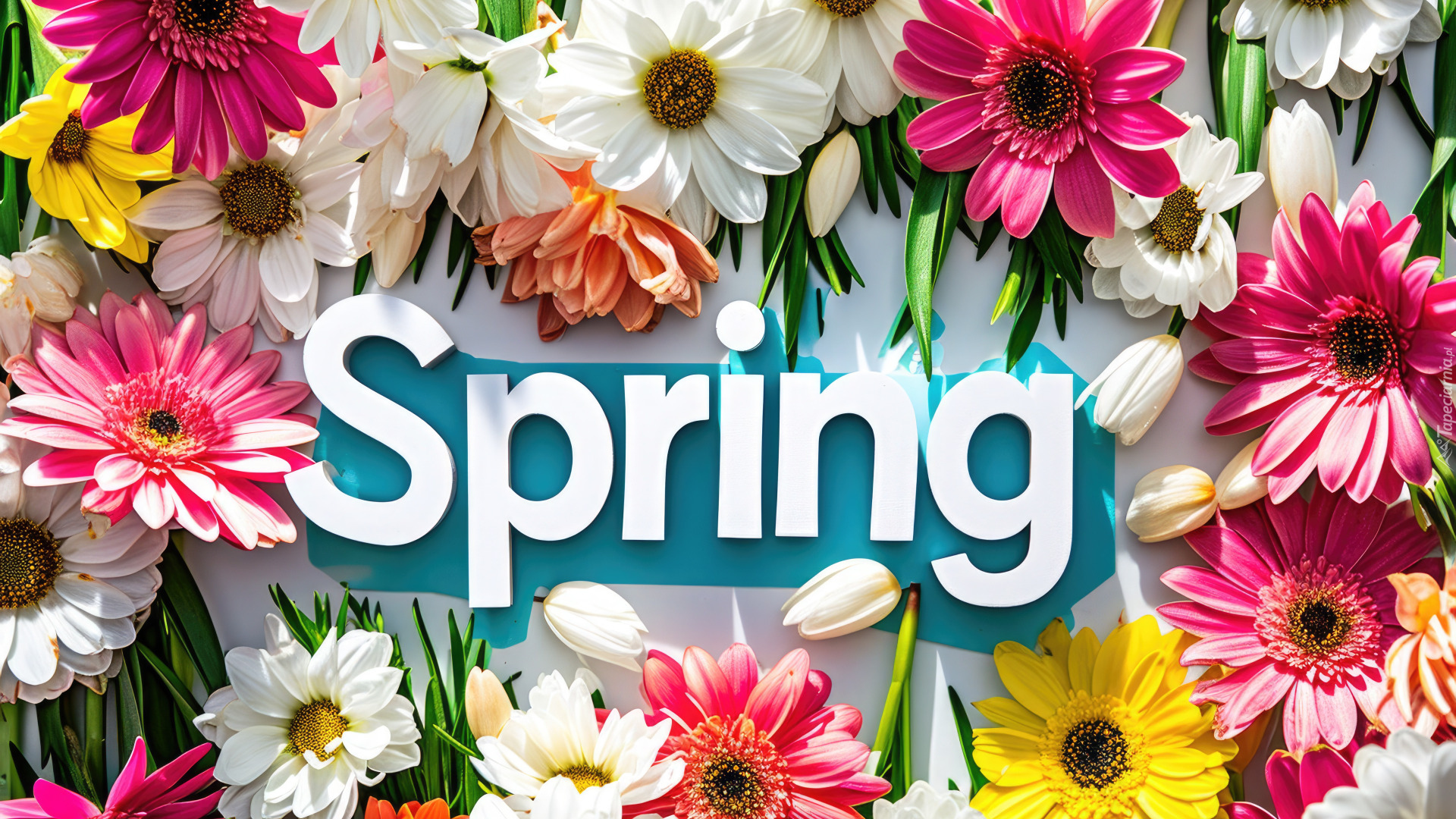 Edytor tapety: Napis Spring wśród kolorowych kwiatów