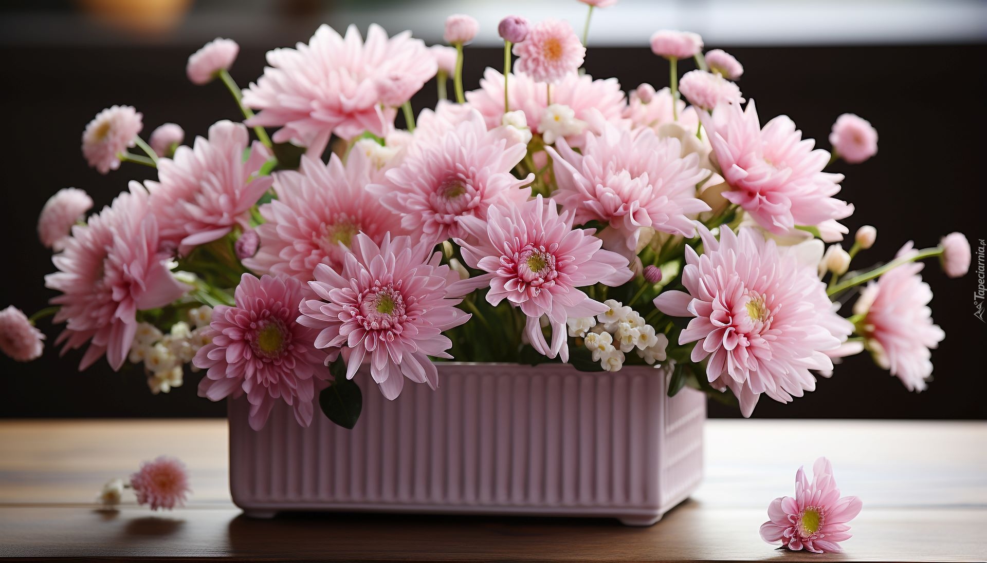 Edytor tapety: Różowe chryzantemy w białej skrzynce