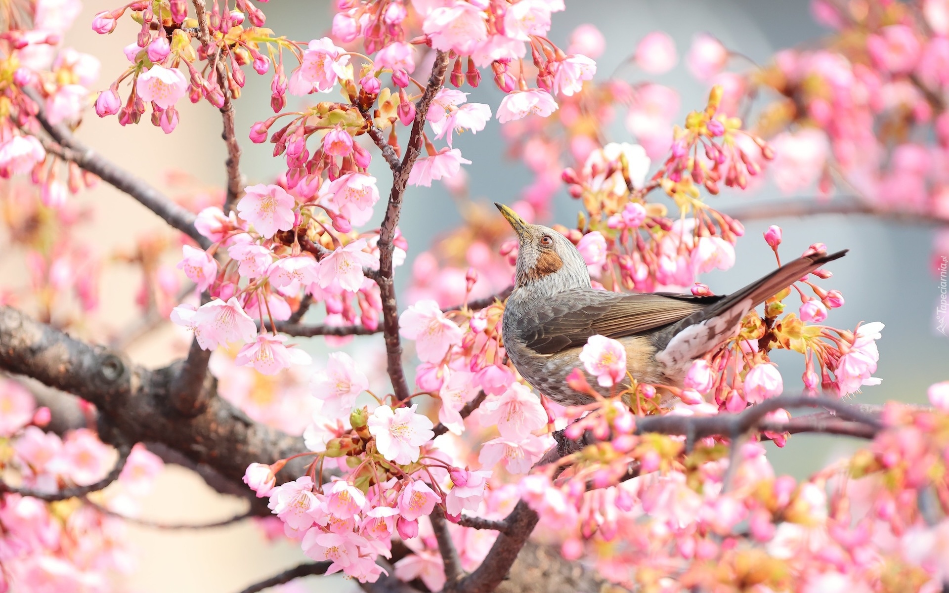 Edytor tapety: Szczeciak rudouchy na gałązce kwitnącego drzewa