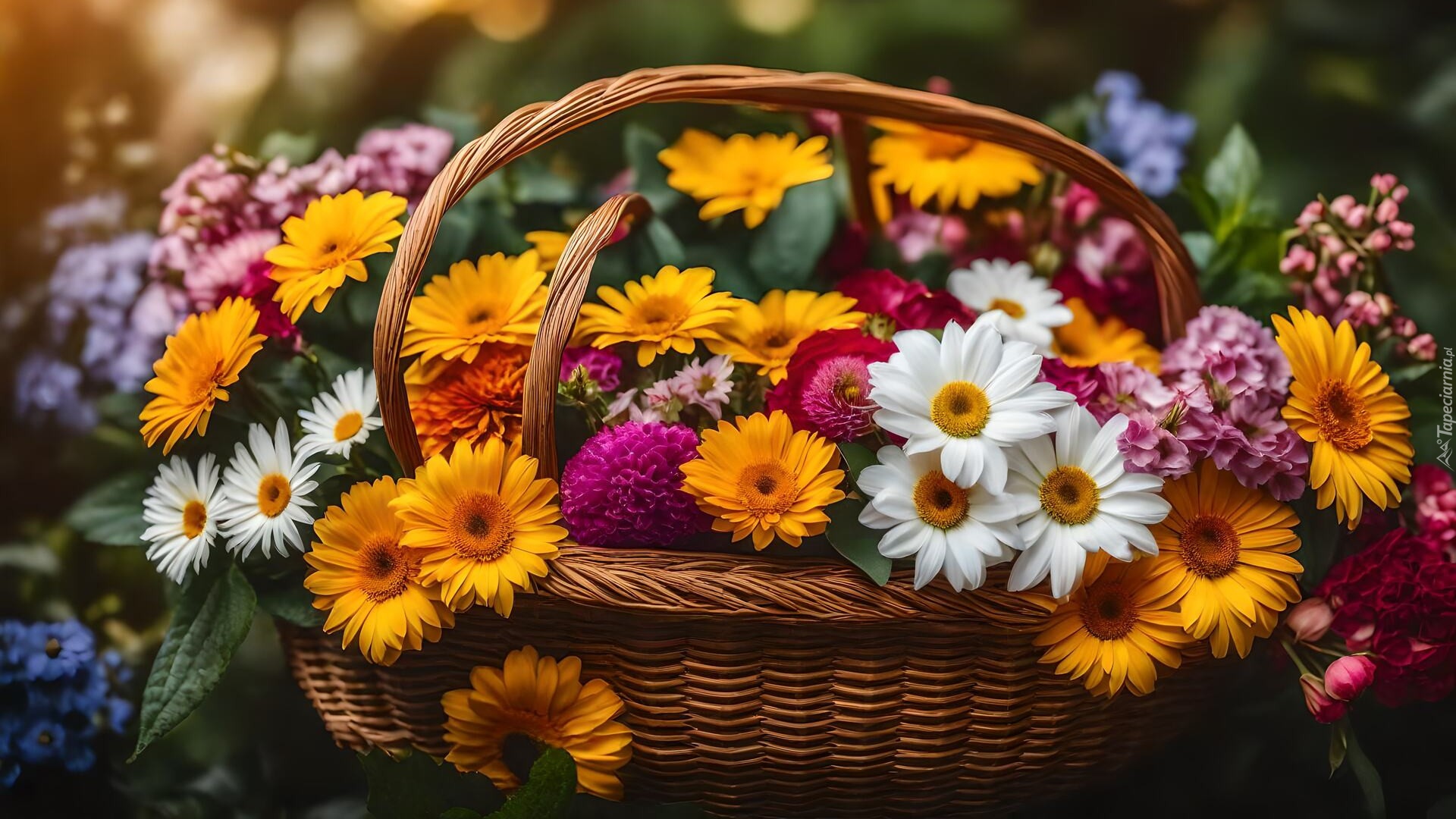 Edytor tapety: Wiklinowy koszyk pełen różnorodnych kwiatów