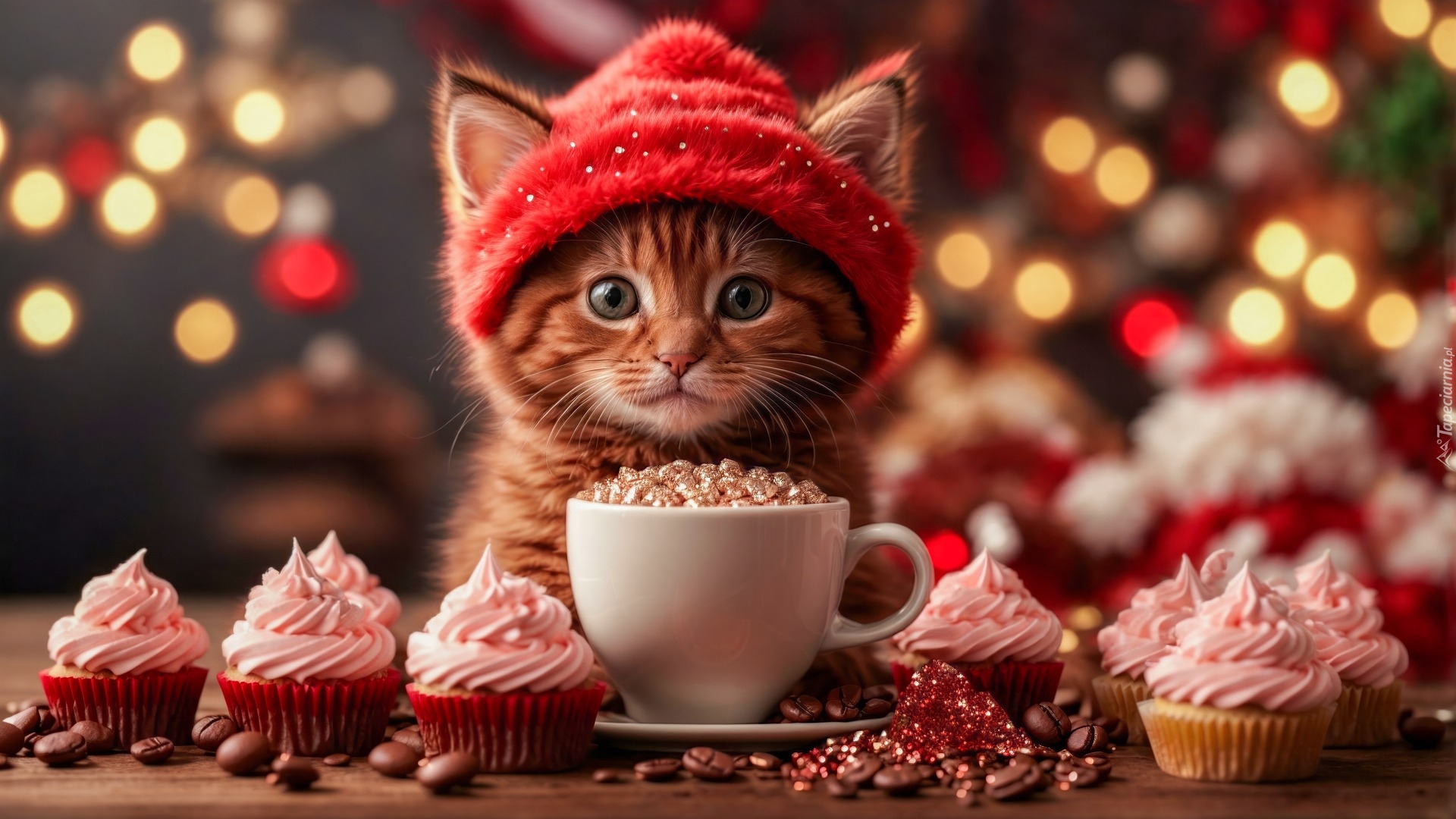 Edytor tapety: Rudy mały kot w czerwonej czapce obok babeczek