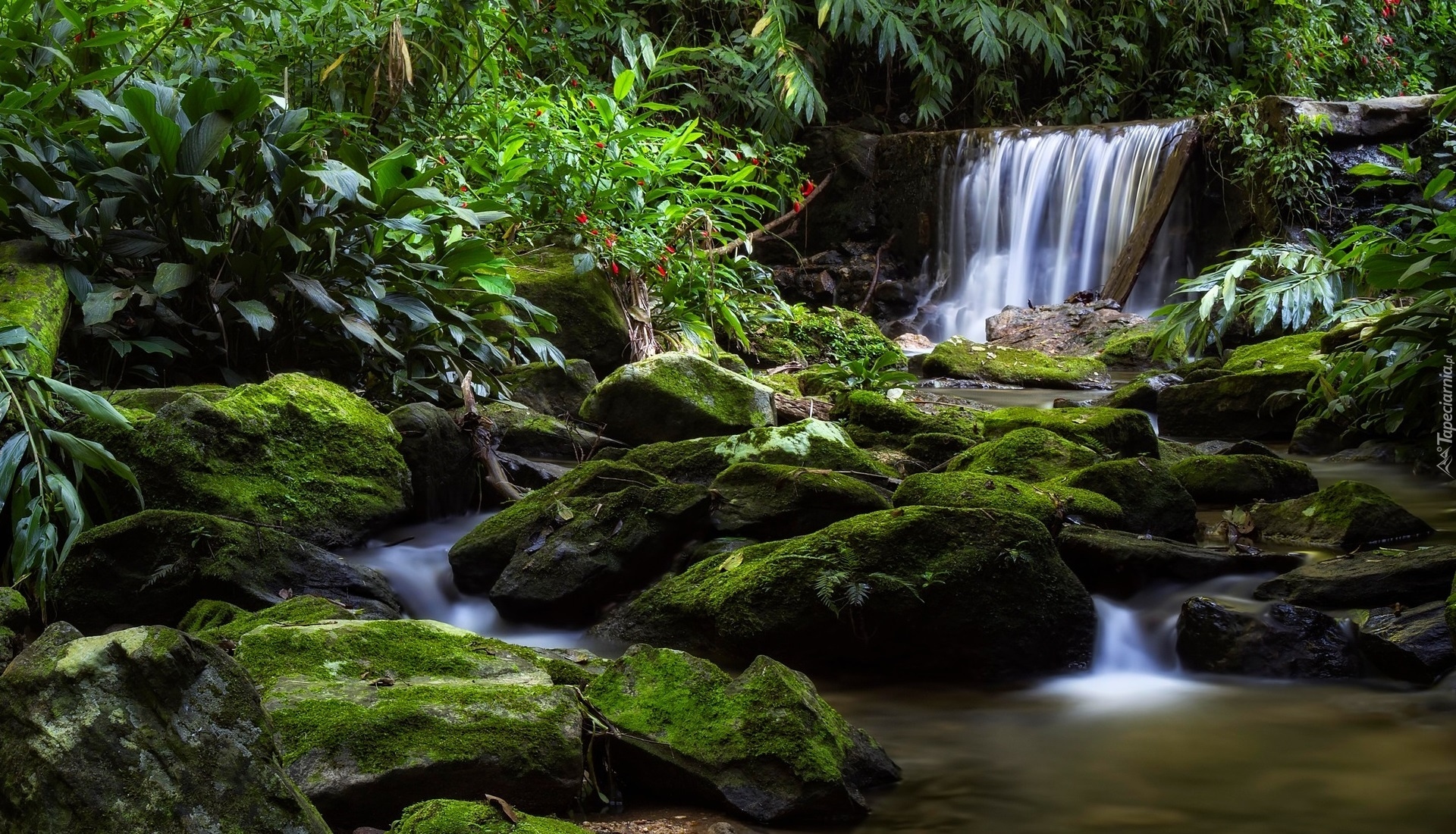 Edytor tapety: Wodospad i omszałe kamienie na leśnej rzece