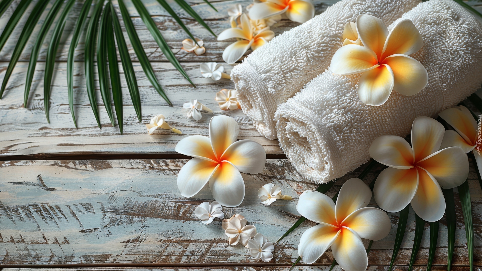 Edytor tapety: Plumerie na ręcznikach i deskach