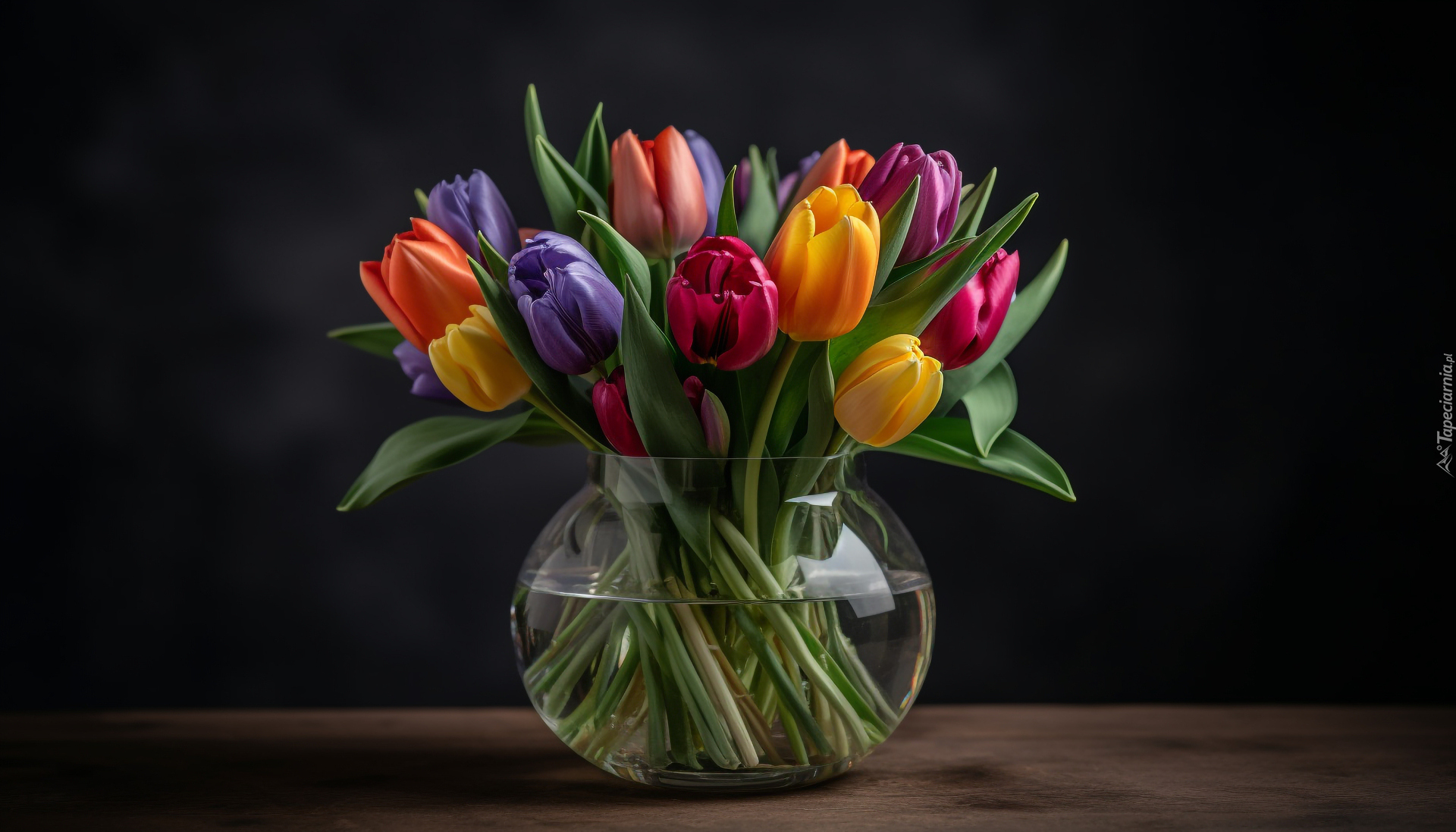Edytor tapety: Kolorowe tulipany w szklanym wazonie na ciemnym tle
