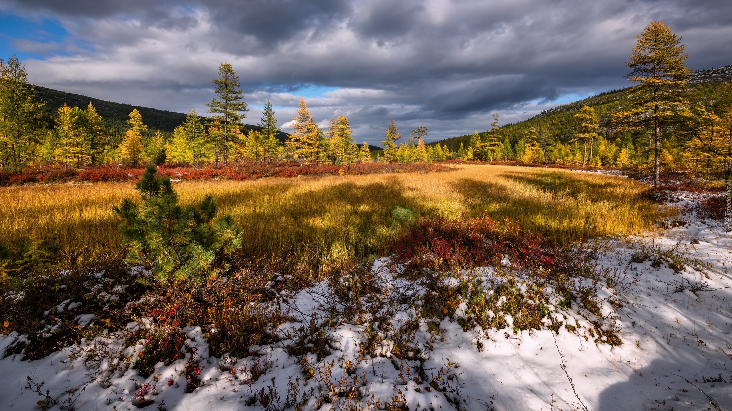 Edytor tapety: Ośnieżona trawa i jesienne drzewa na Kołymie