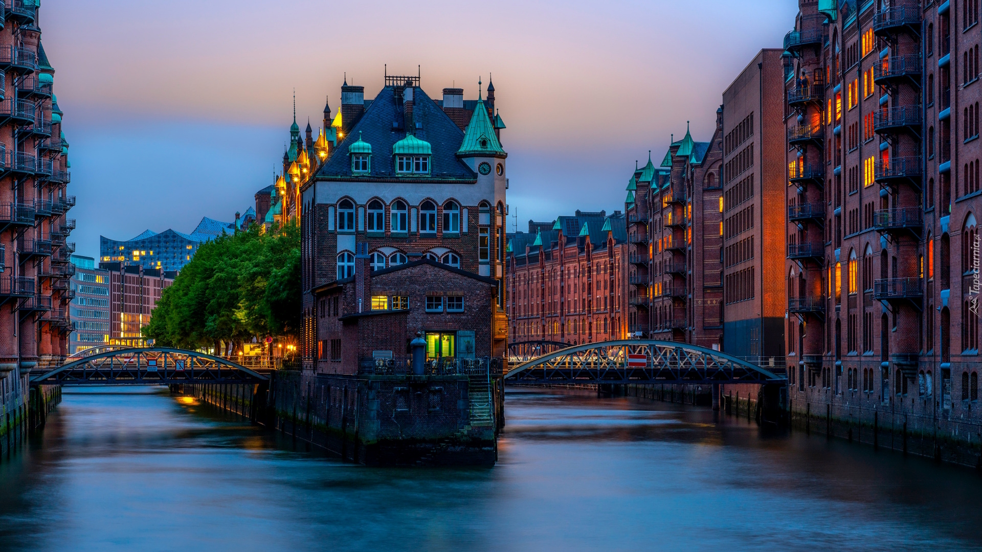 Edytor tapety: Kompleks budynków Speicherstadt wzdłuż kanału w Hamburgu
