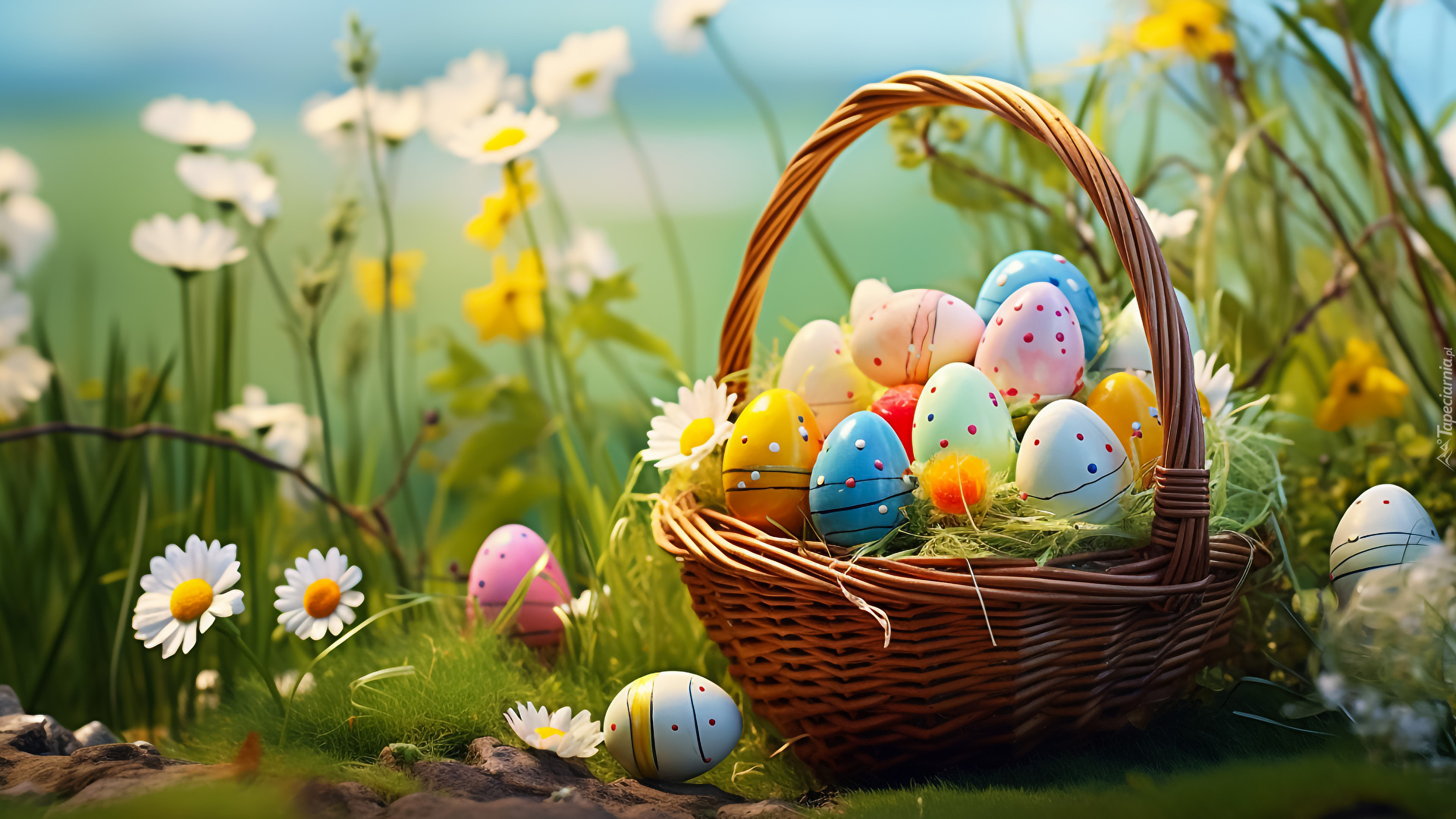 Edytor tapety: Wiklinowy koszyk z pisankami wśród kwiatów