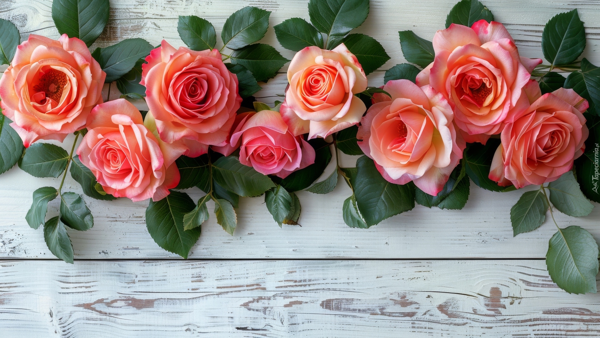 Edytor tapety: Różowe róże z liśćmi na deskach