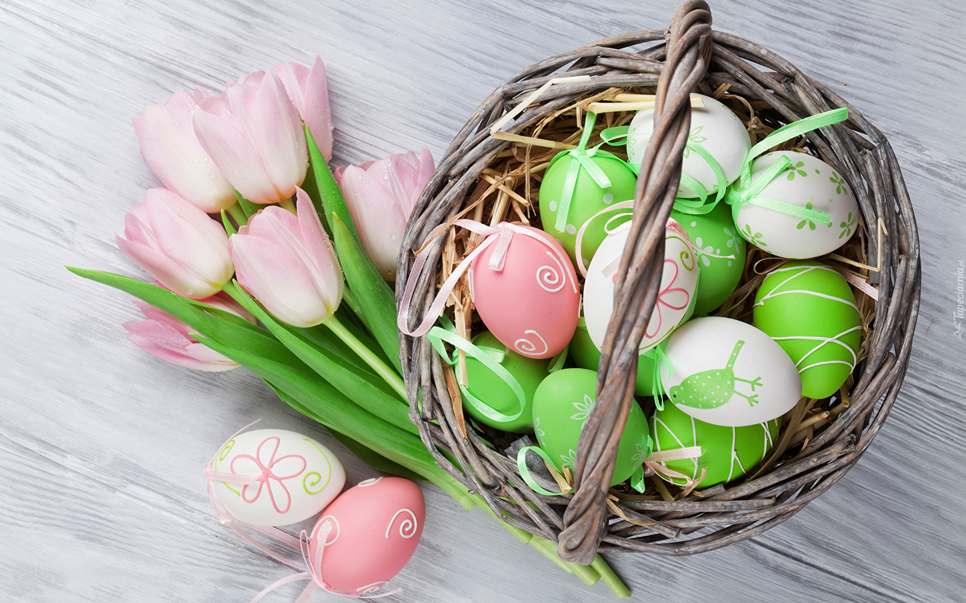 Edytor tapety: Tulipany obok koszyka z kolorowymi pisankami