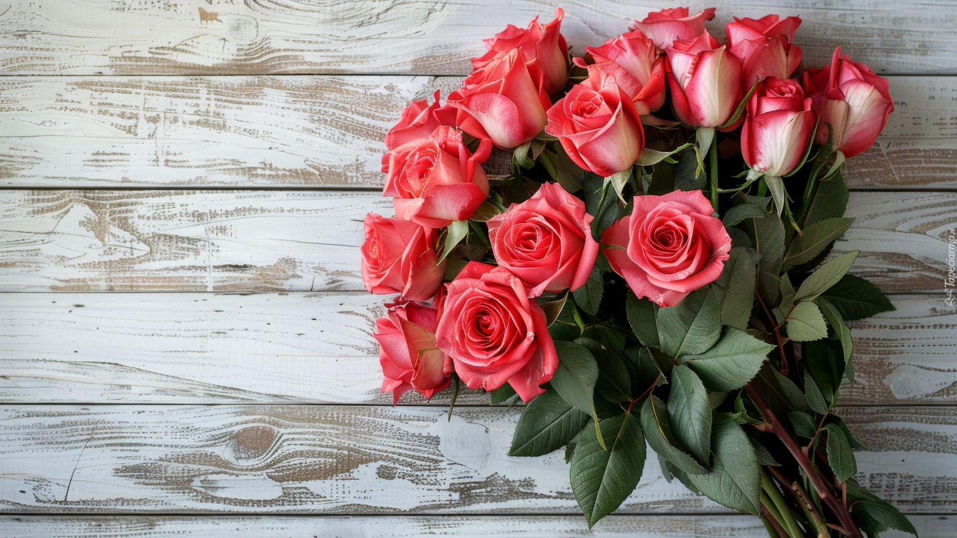 Edytor tapety: Bukiet czerwonych róż na białych deskach
