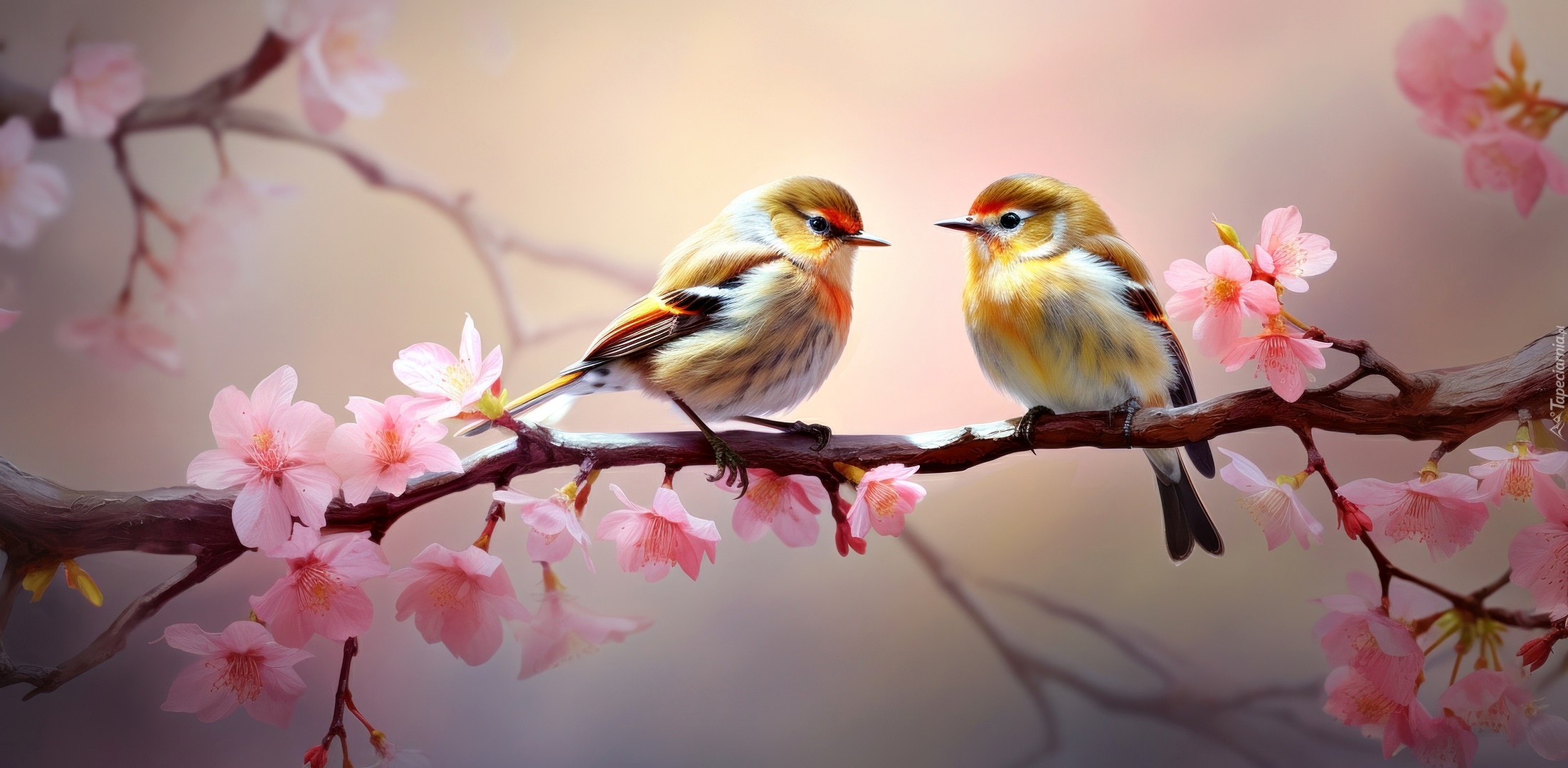 Edytor tapety: Dwa ptaszki na gałązce z różowymi kwiatkami