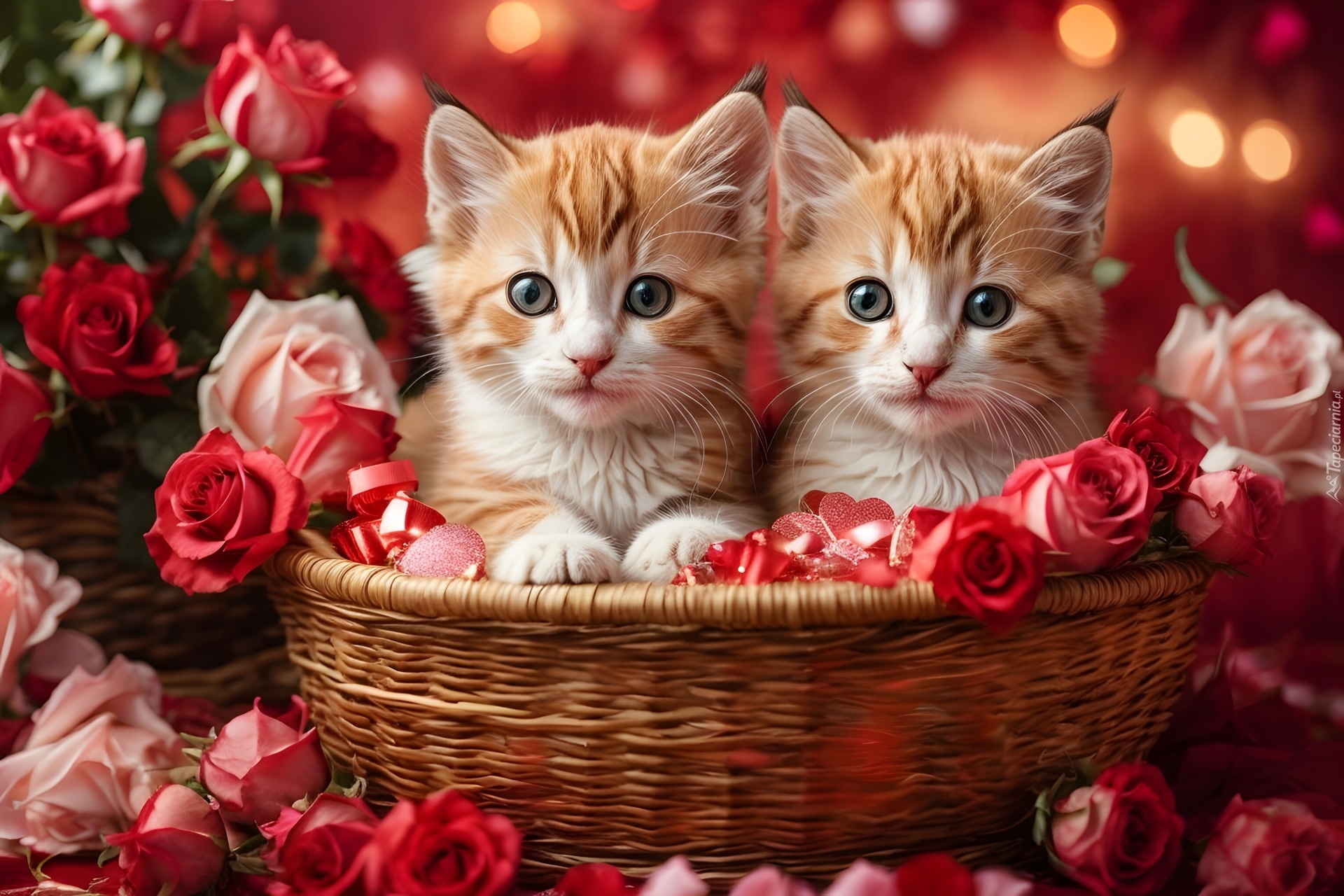 Edytor tapety: Dwa kotki w koszyku wśród róż