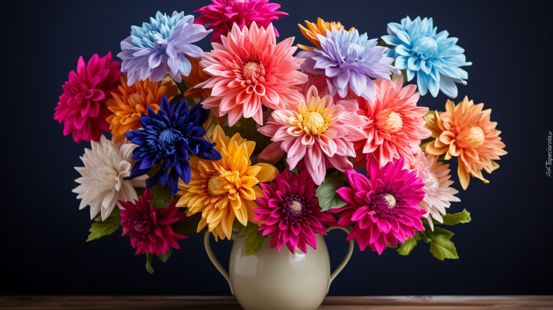 Edytor tapety: Bukiet kolorowych dalii w dzbanku na ciemnym tle