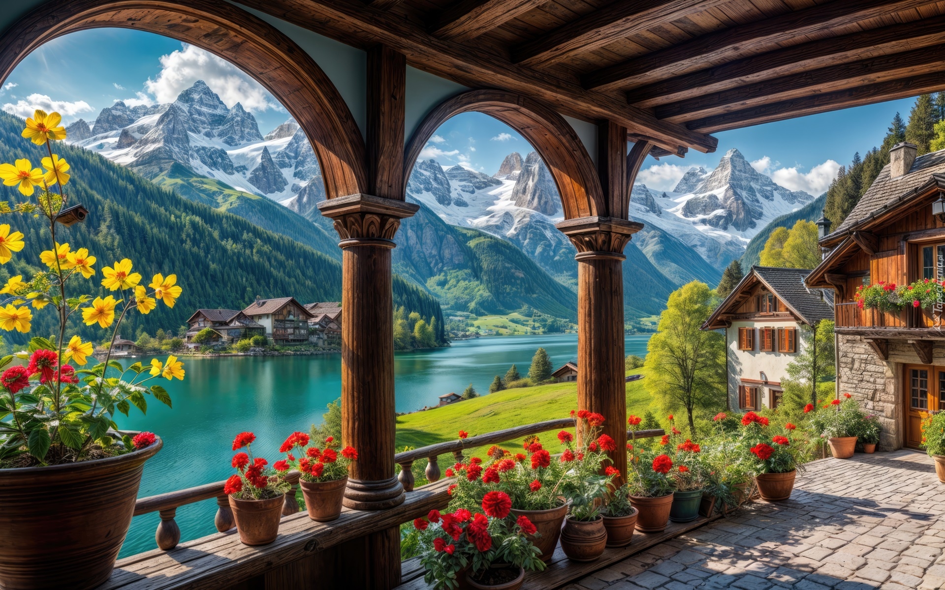 Edytor tapety: Widok z tarasu na jezioro i ośnieżone góry