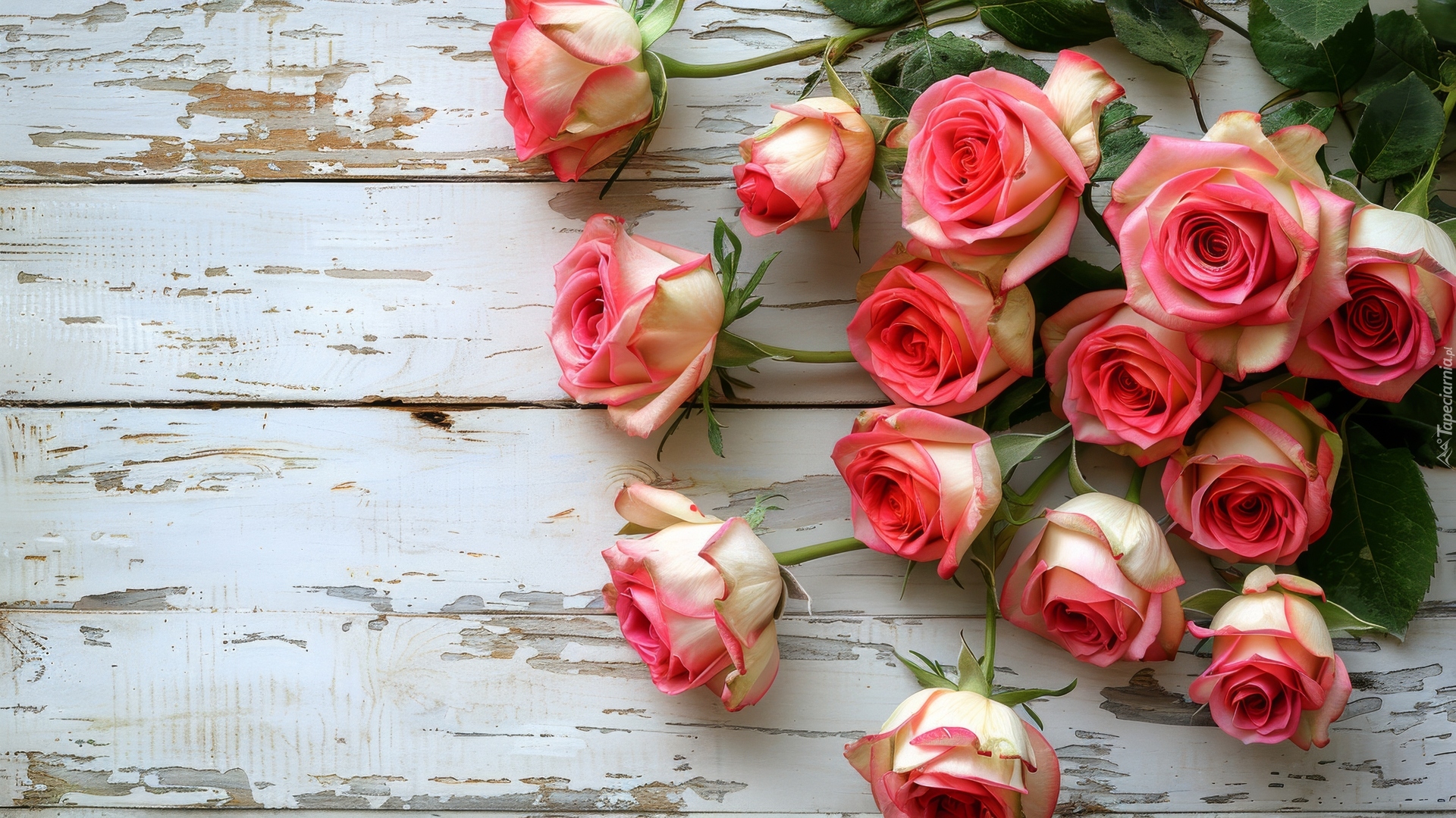 Edytor tapety: Bukiet dwukolorowych róż na białych deskach