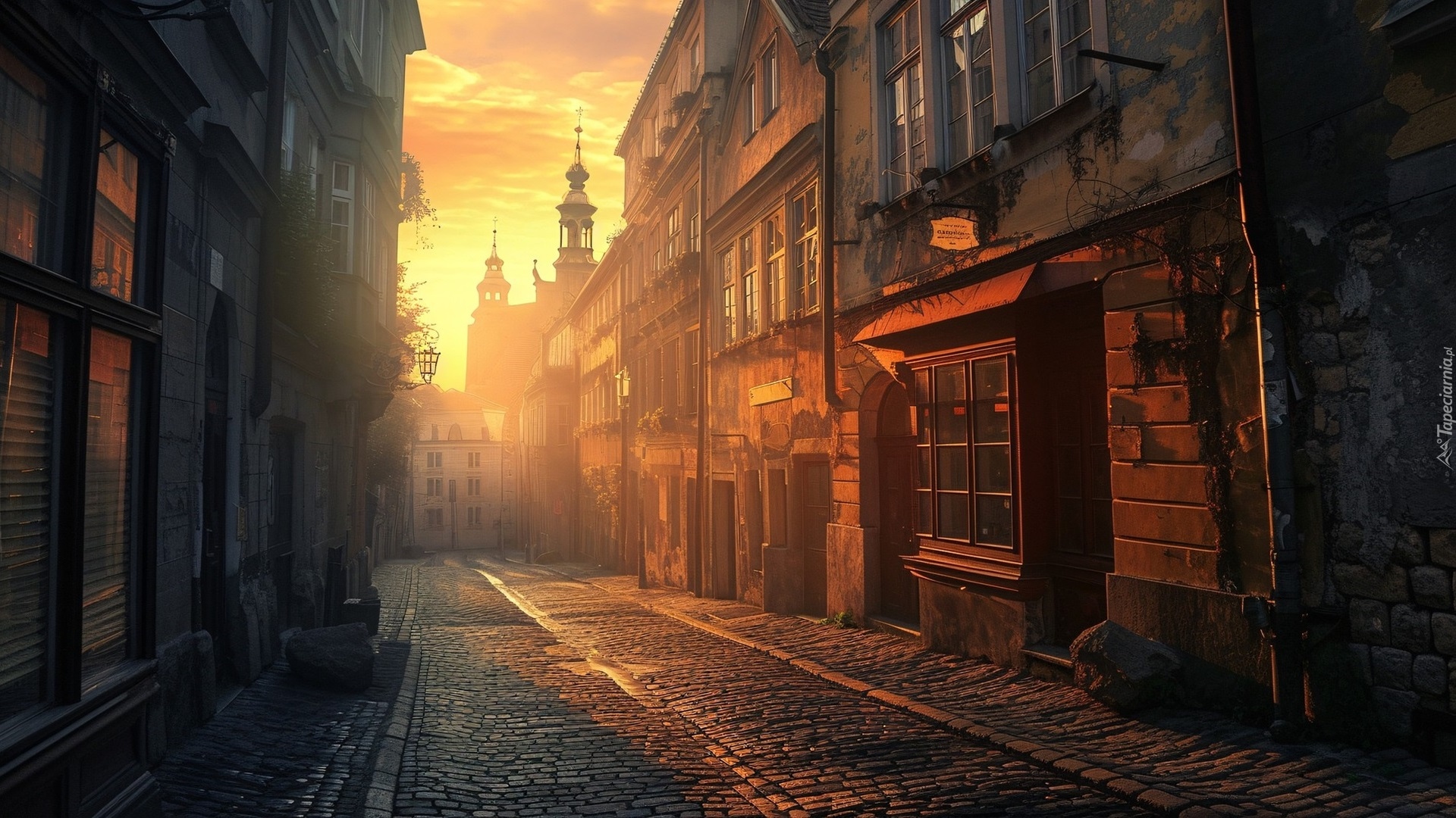 Edytor tapety: Kamienice przy rozświetlonej blaskiem słońca ulicy