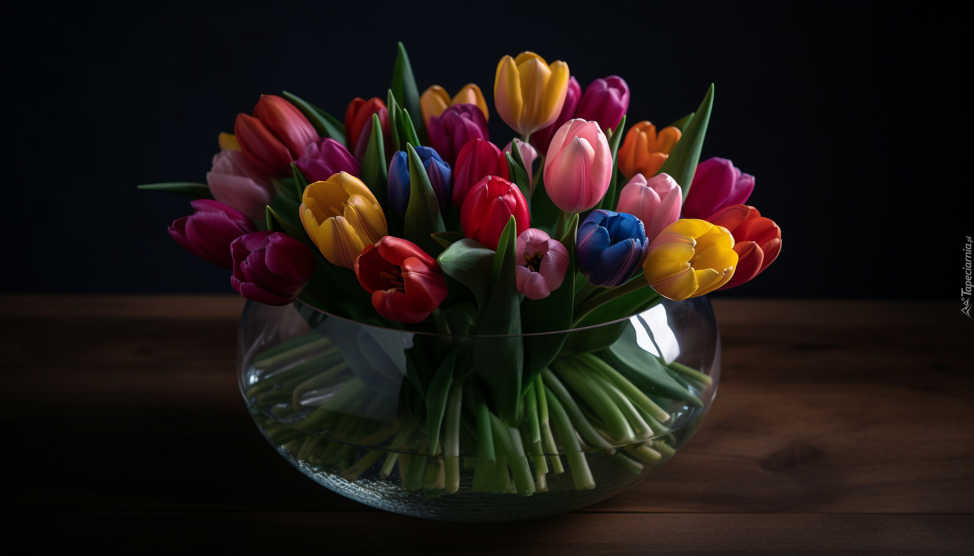 Edytor tapety: Bukiet różnokolorowych tulipanów w szklanym wazonie