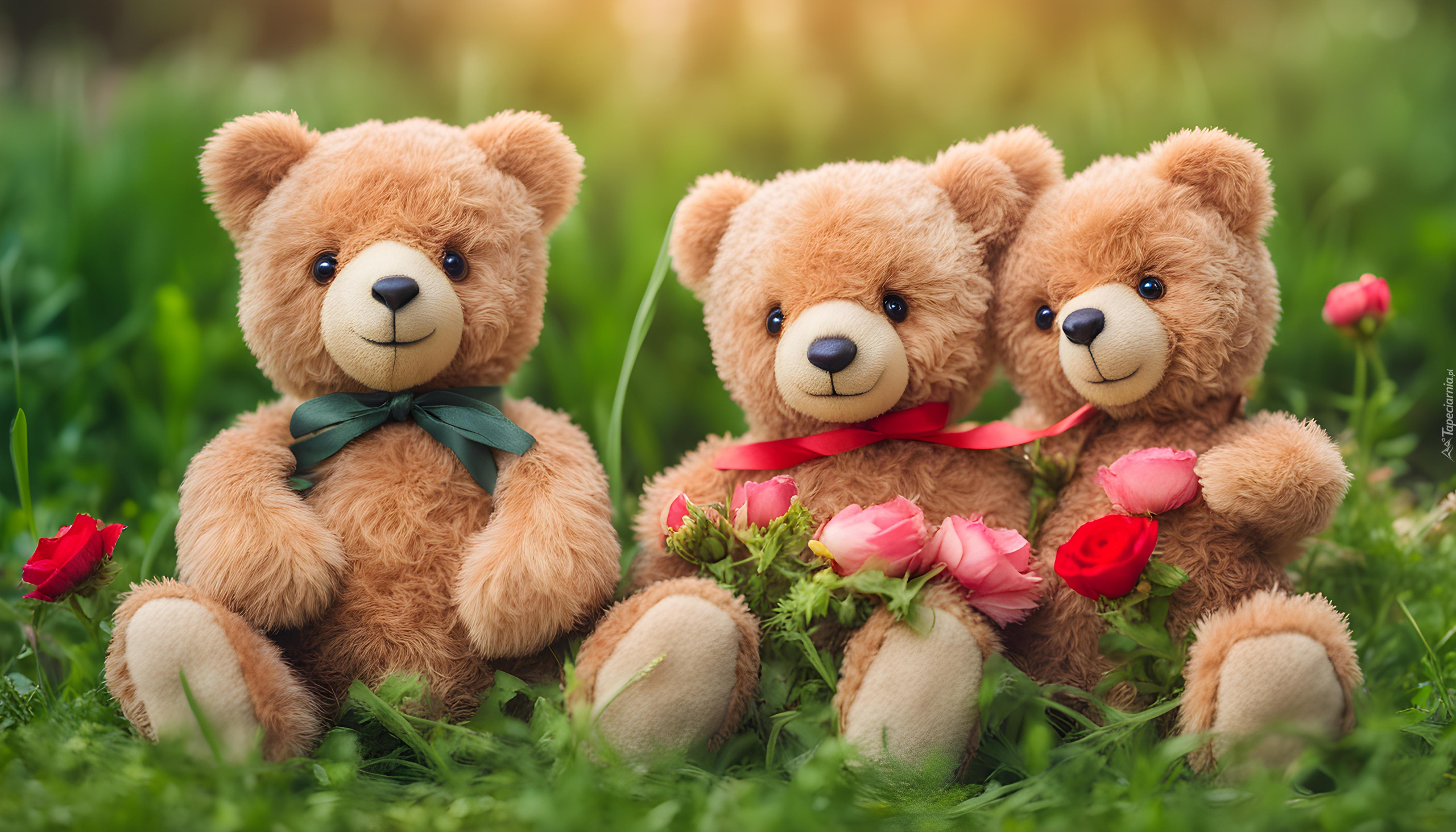 Edytor tapety: Trzy pluszowe misie z różami na trawie