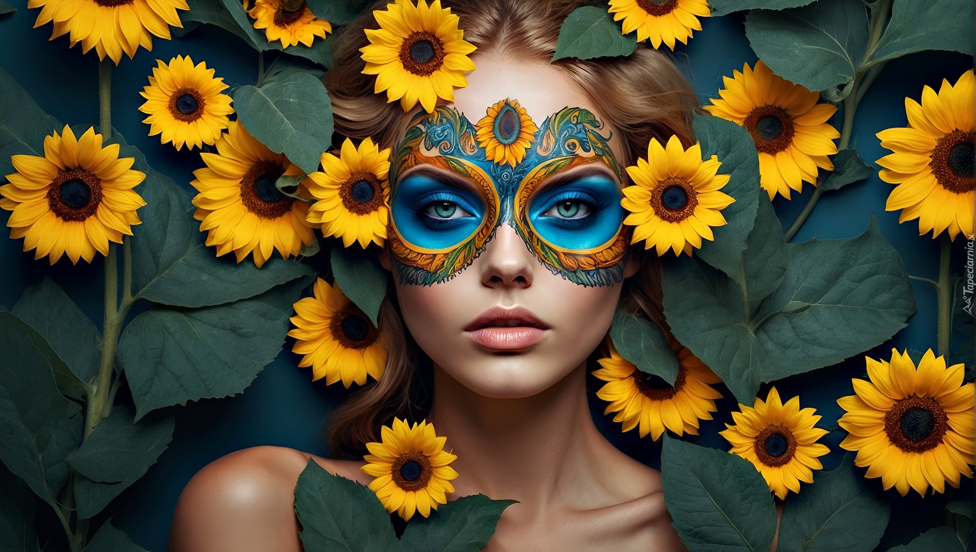 Edytor tapety: Twarz kobiety w makijażu otoczona słonecznikami