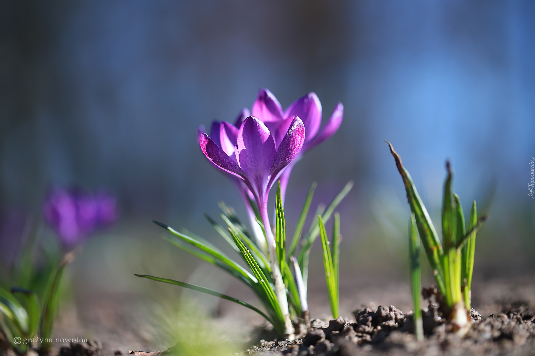 Edytor tapety: Rozświetlone blaskiem słońca dwa fioletowe krokusy