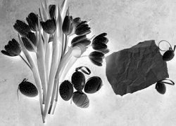 Edytor tapety: Tulipany i pisanki obok kartki papieru na ciemnym tle