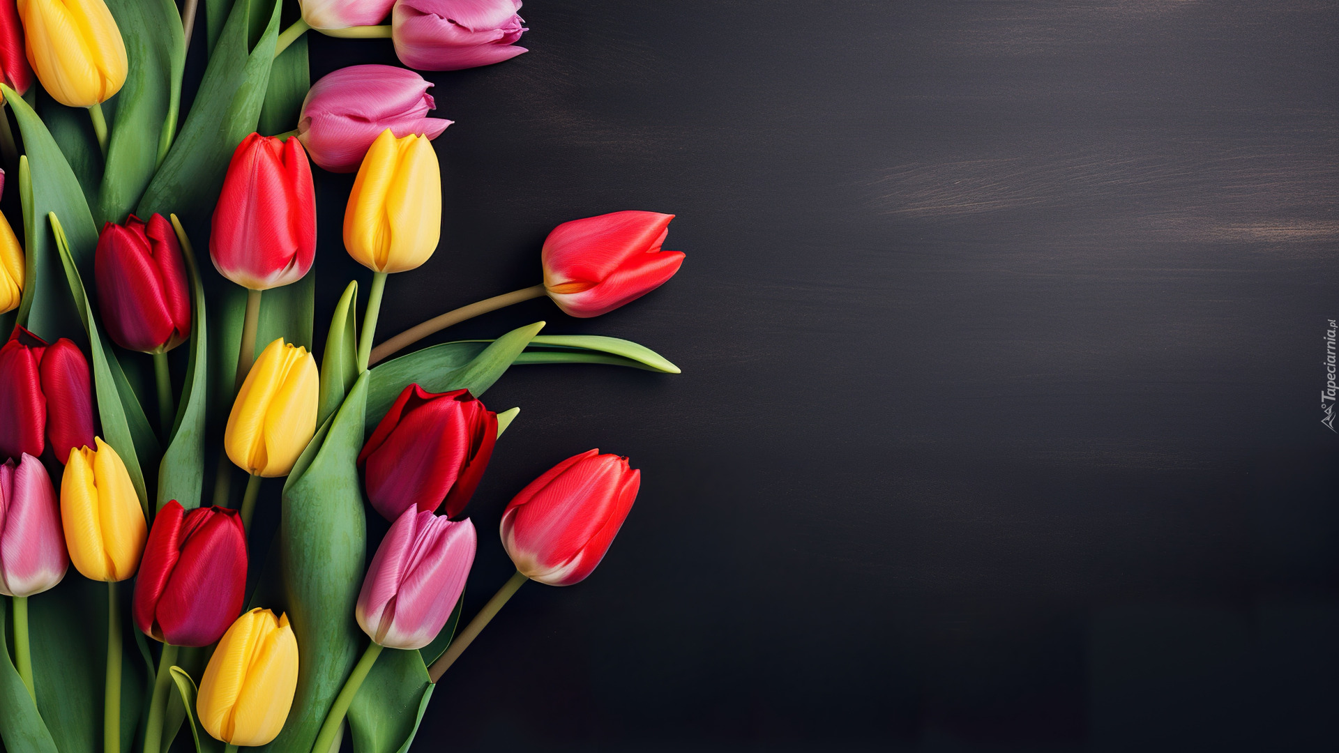 Edytor tapety: Różnokolorowe tulipany na ciemnym tle
