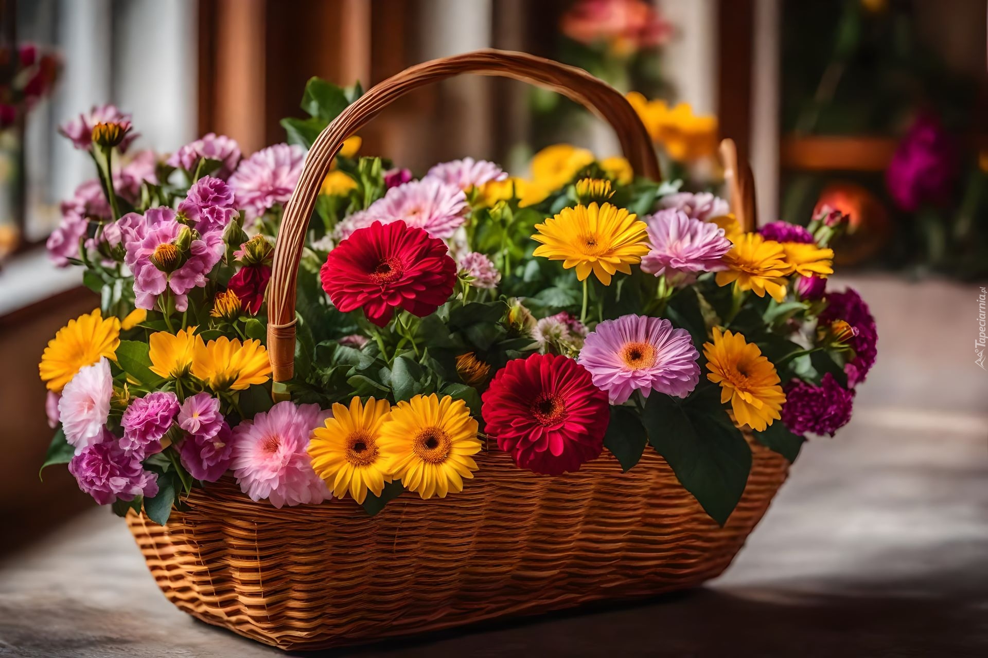 Edytor tapety: Kolorowy bukiet kwiatów w wiklinowym koszyku