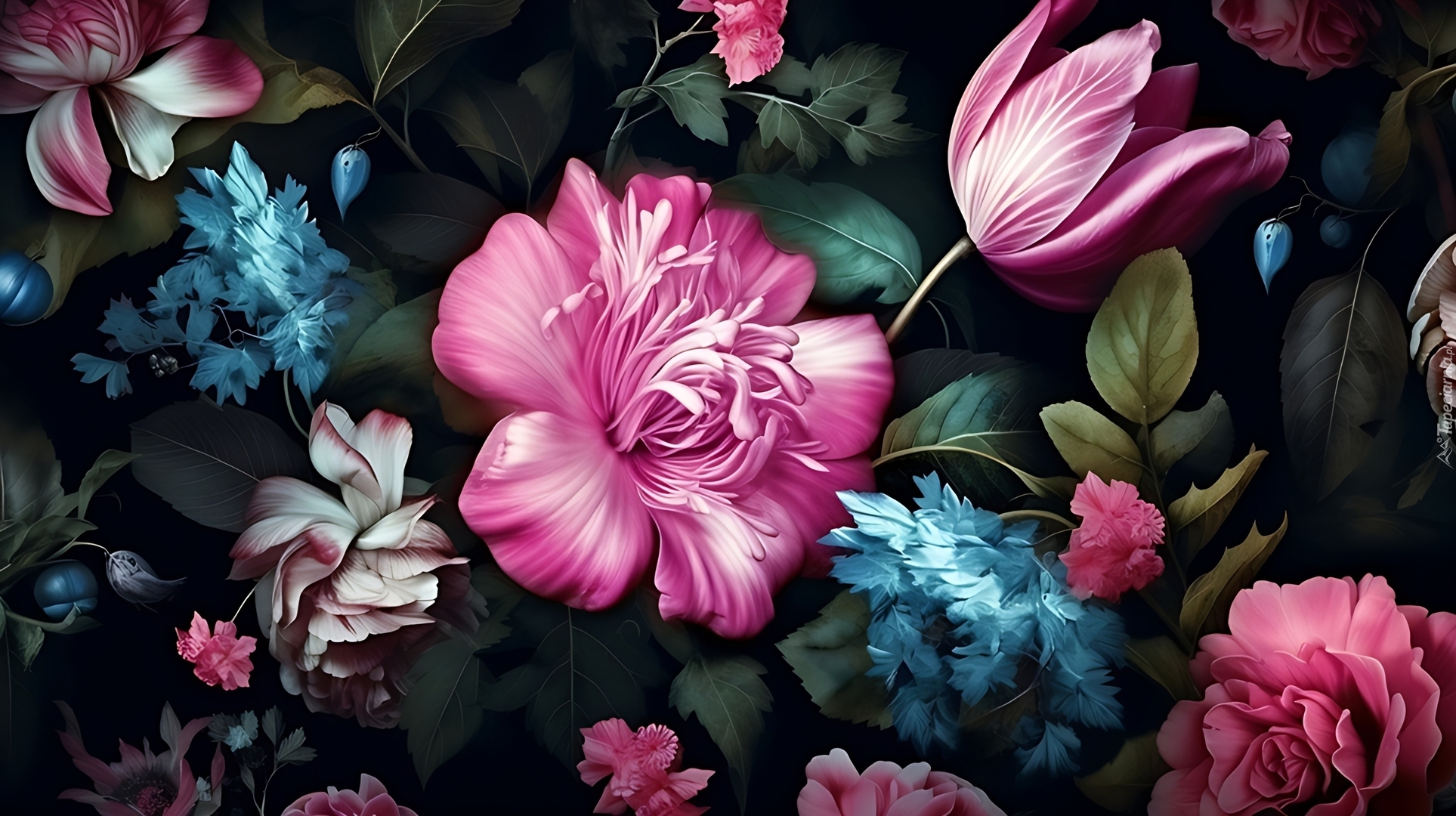 Edytor tapety: Różowe i niebieskie kwiaty wśród liści