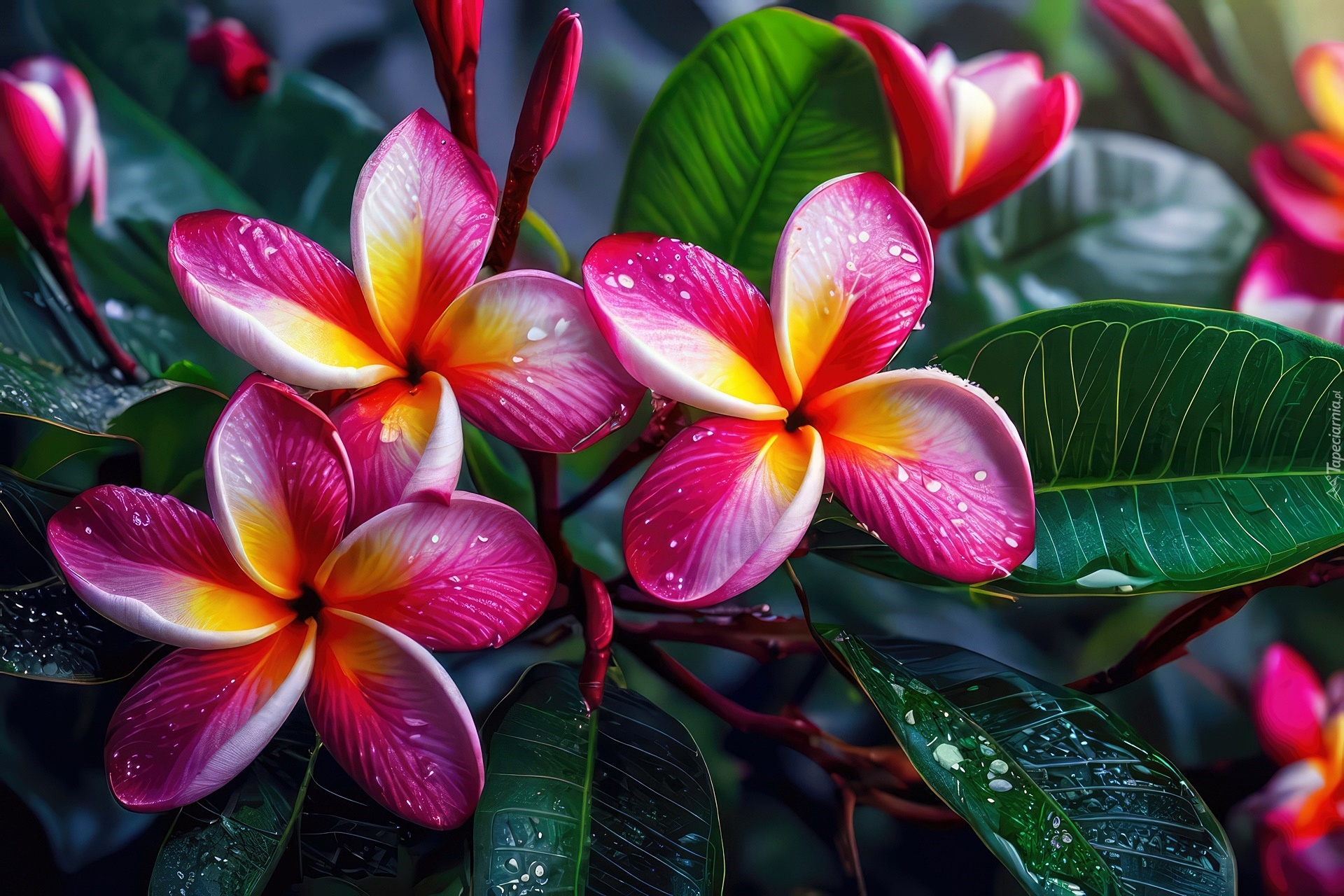 Edytor tapety: Kolorowe kwiaty plumerii z kroplami wody