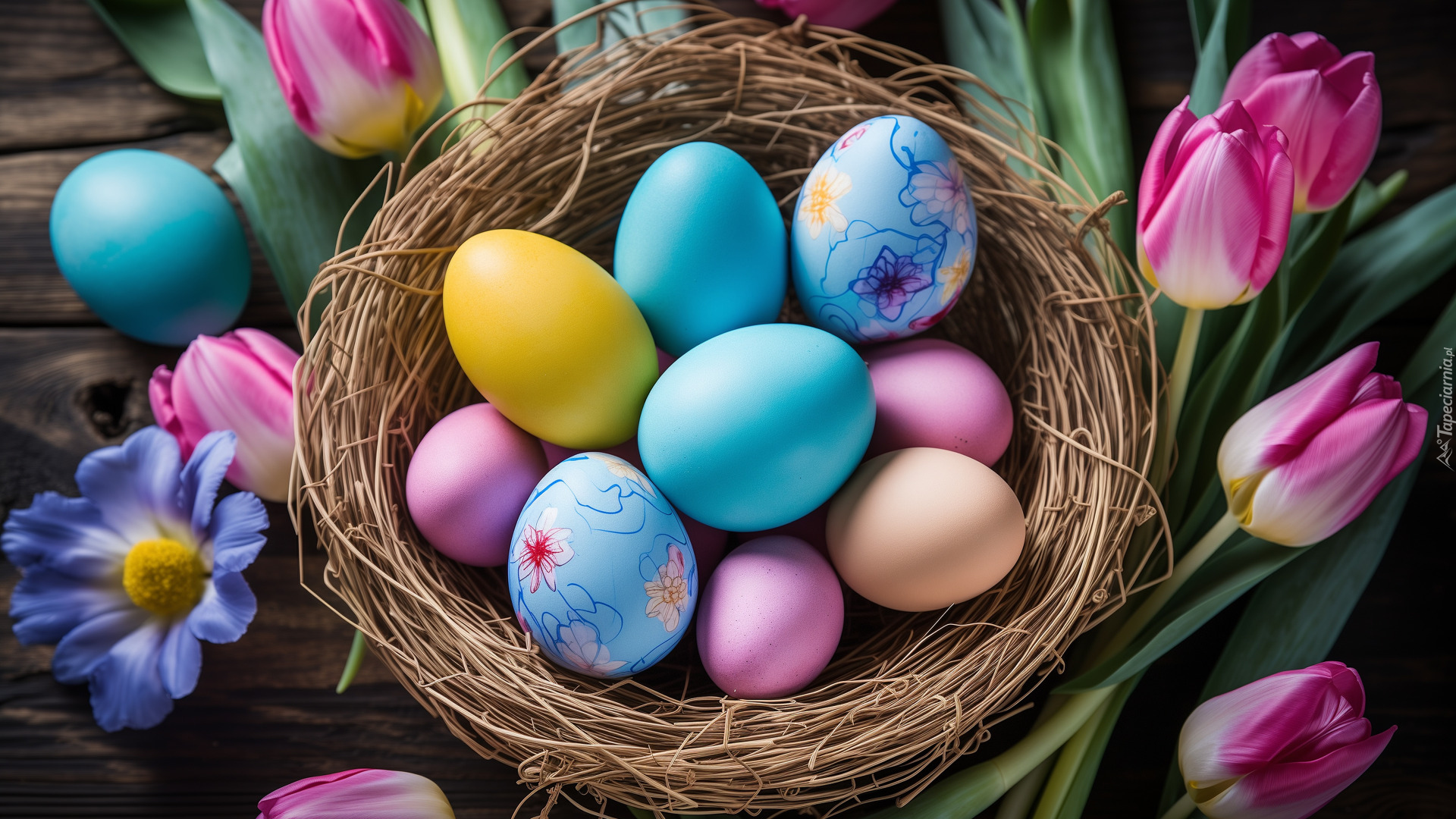 Edytor tapety: Pisanki w gniazdku na różowych tulipanach