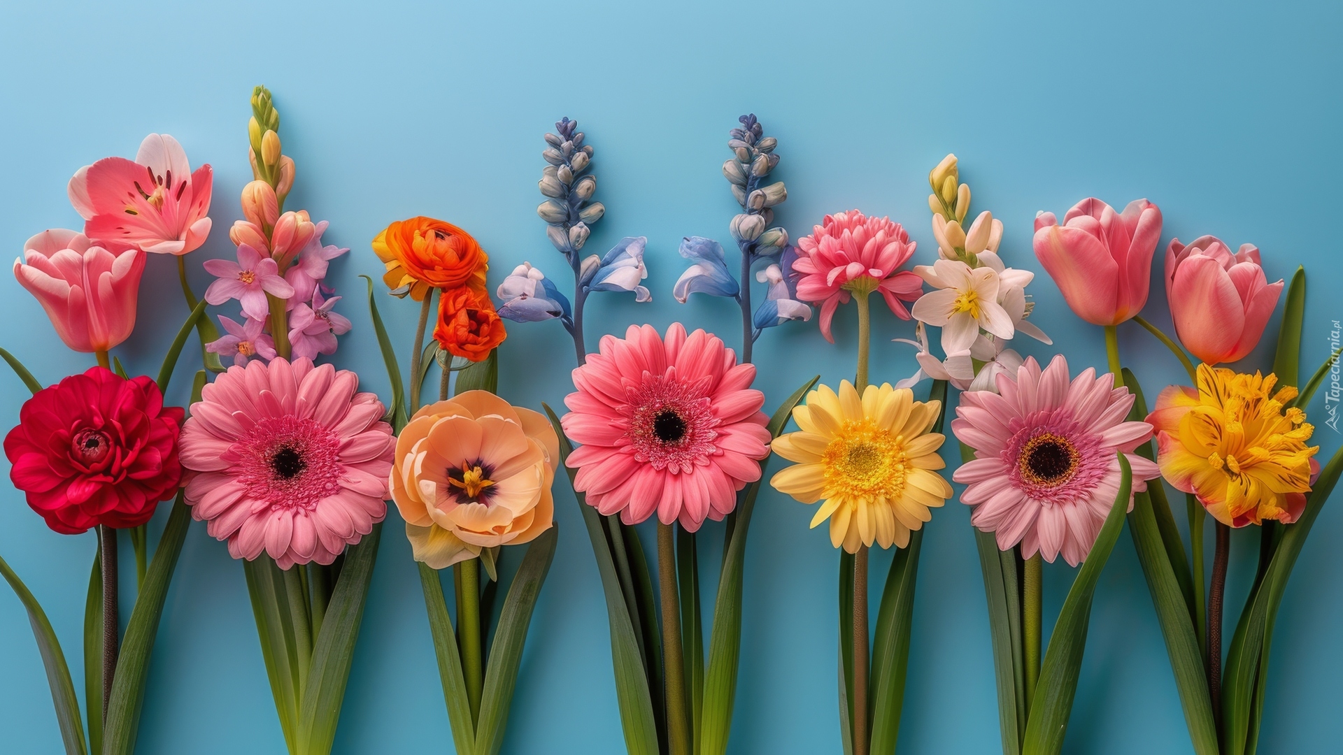 Edytor tapety: Dwa rzędy kolorowych kwiatów na niebieskim tle