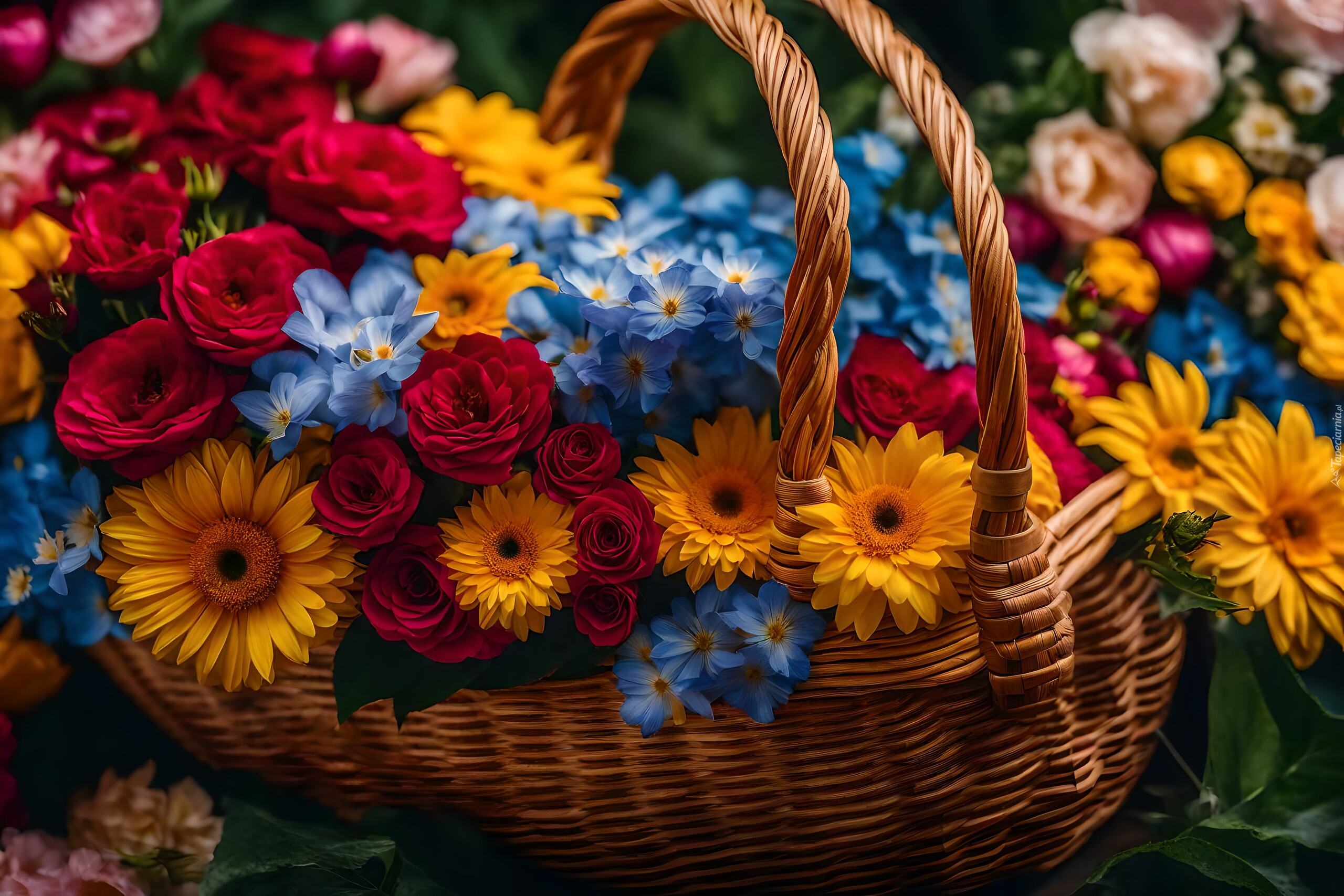 Edytor tapety: Pełen kosz kolorowych kwiatów w zbliżeniu