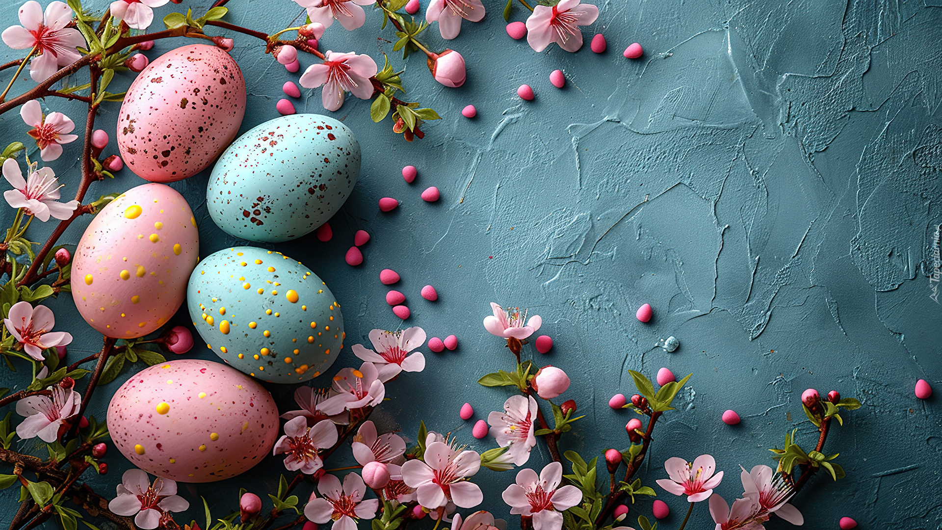 Edytor tapety: Gałązki z różowymi kwiatkami i nakrapiane pisanki