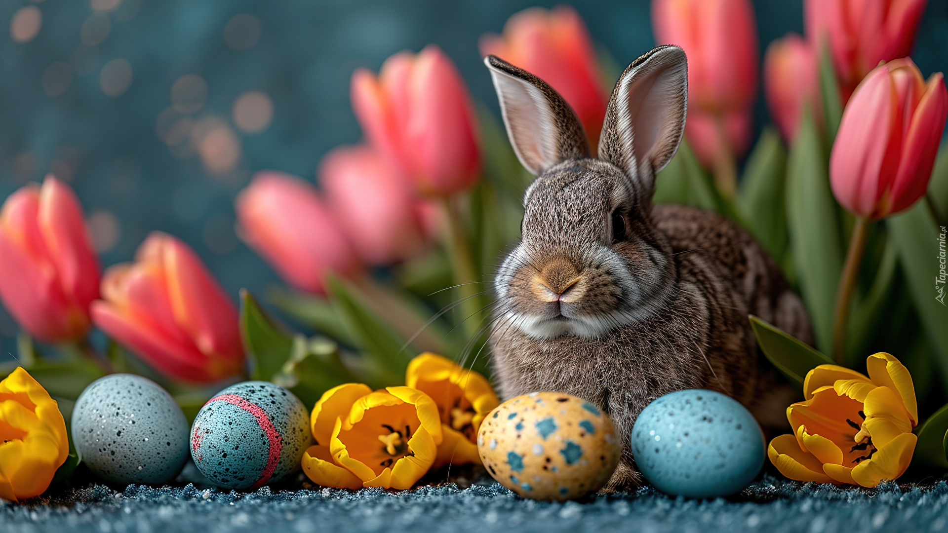 Edytor tapety: Pisanki i królik obok tulipanów