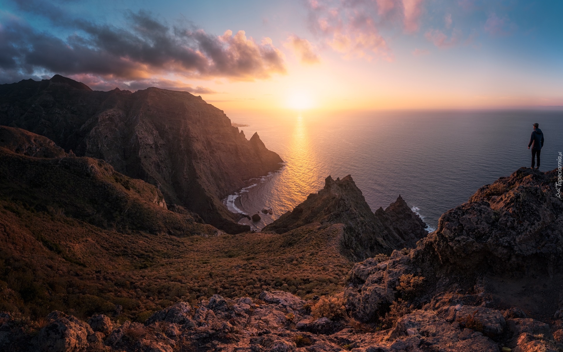 Edytor tapety: Człowiek stojący na skale na tle morza