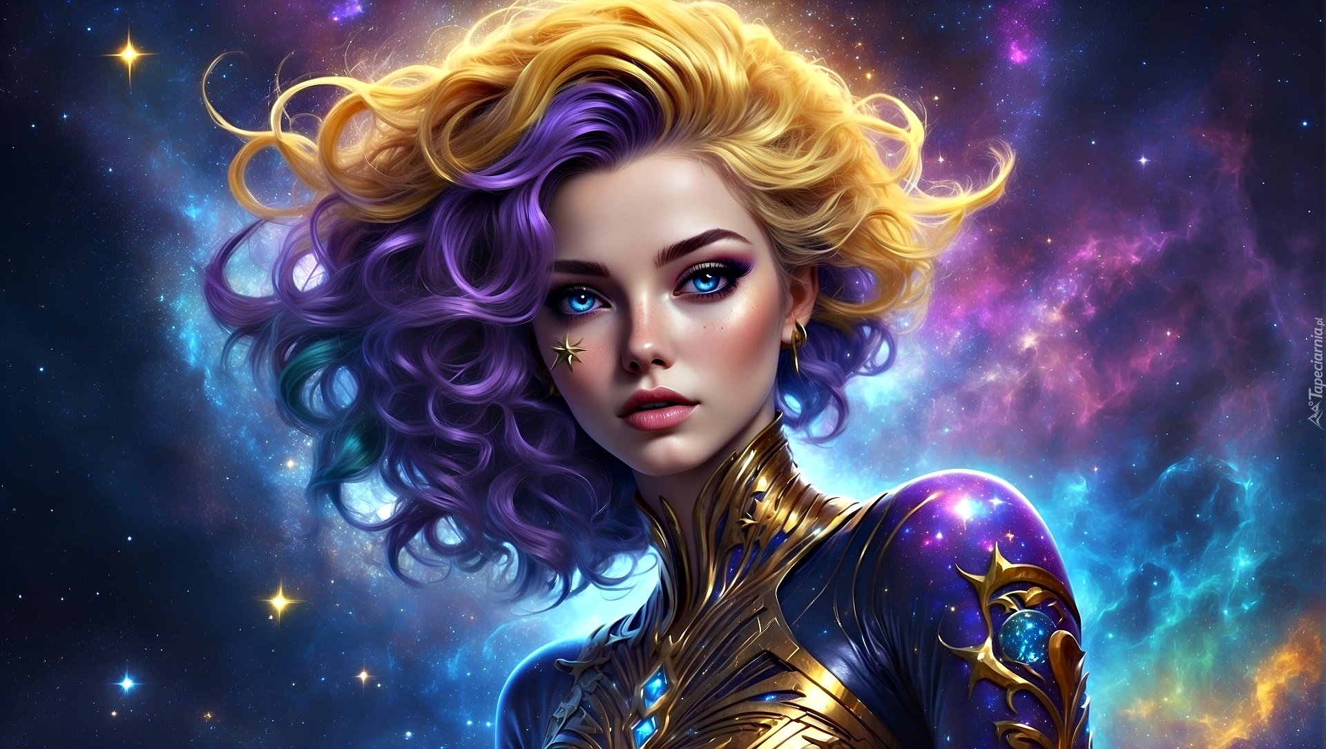 Edytor tapety: Twarz niebieskookiej kobiety na tle kolorowego nocnego nieba