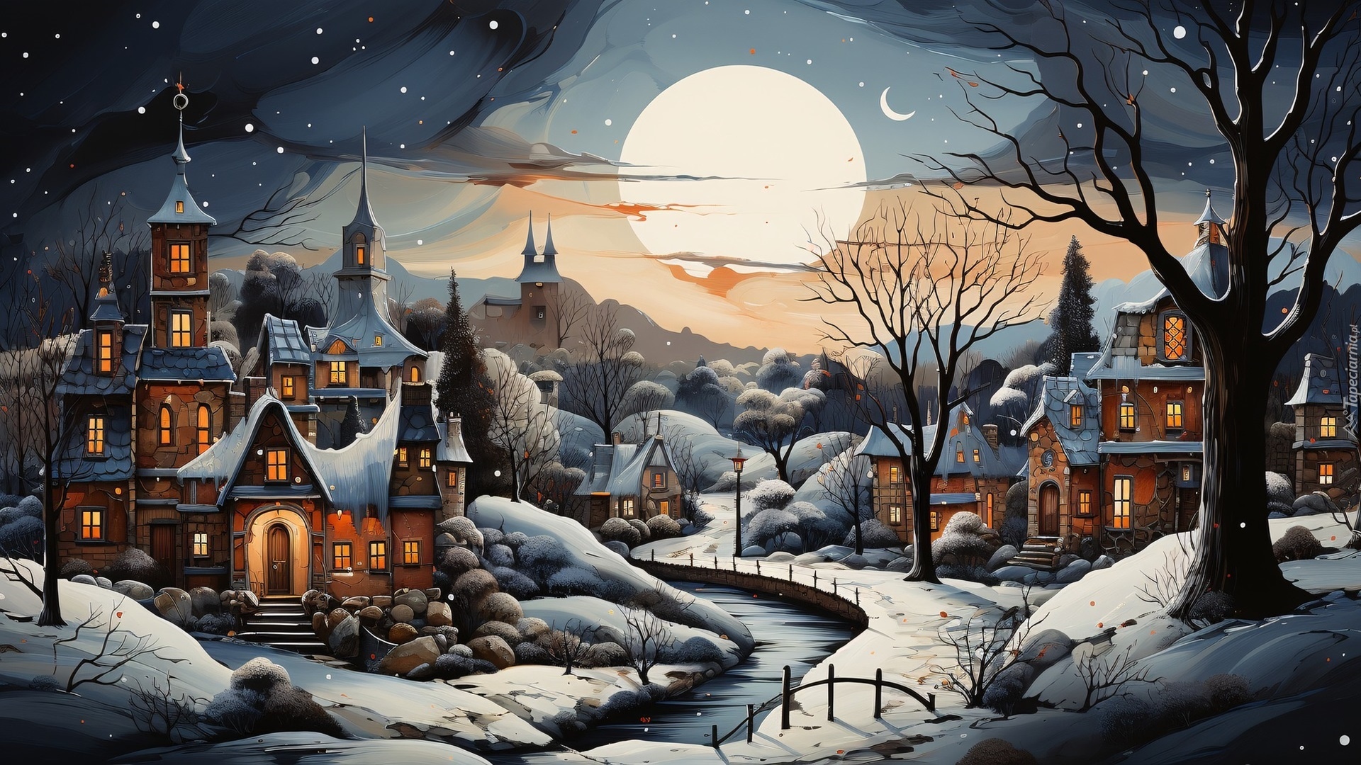 Edytor tapety: Księżyc nad oświetlonymi domami nad kanałem zimową porą