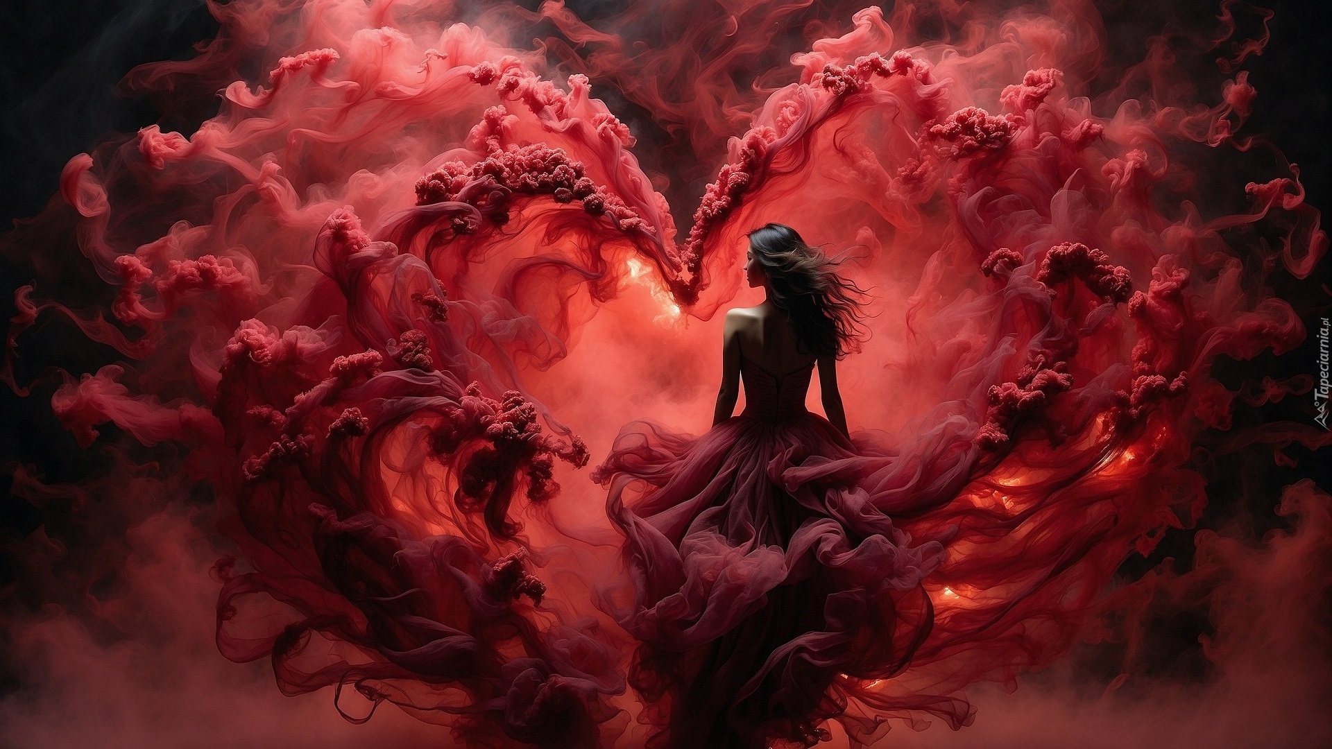 Edytor tapety: Kobieta w sukni otoczona czerwonym dymem