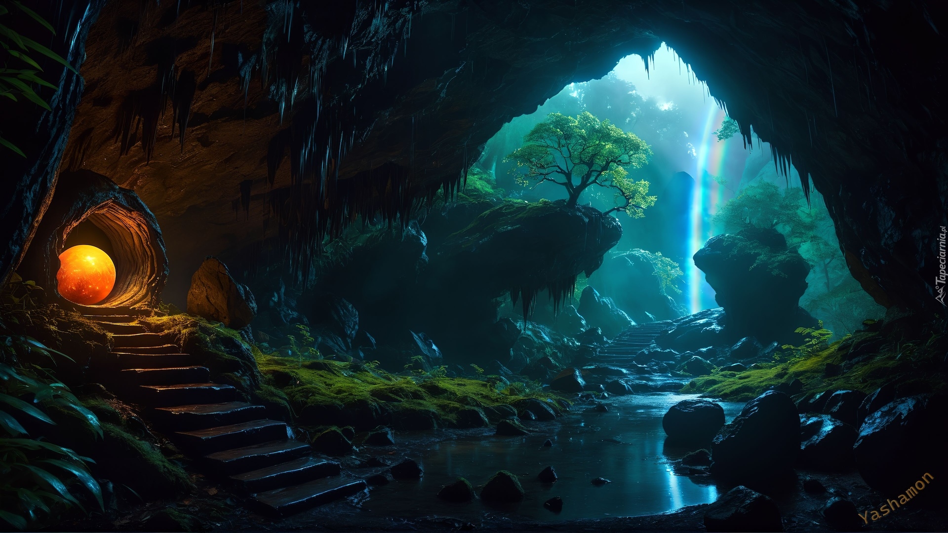 Edytor tapety: Jaskinia z rozświetlonymi schodami i rzeką