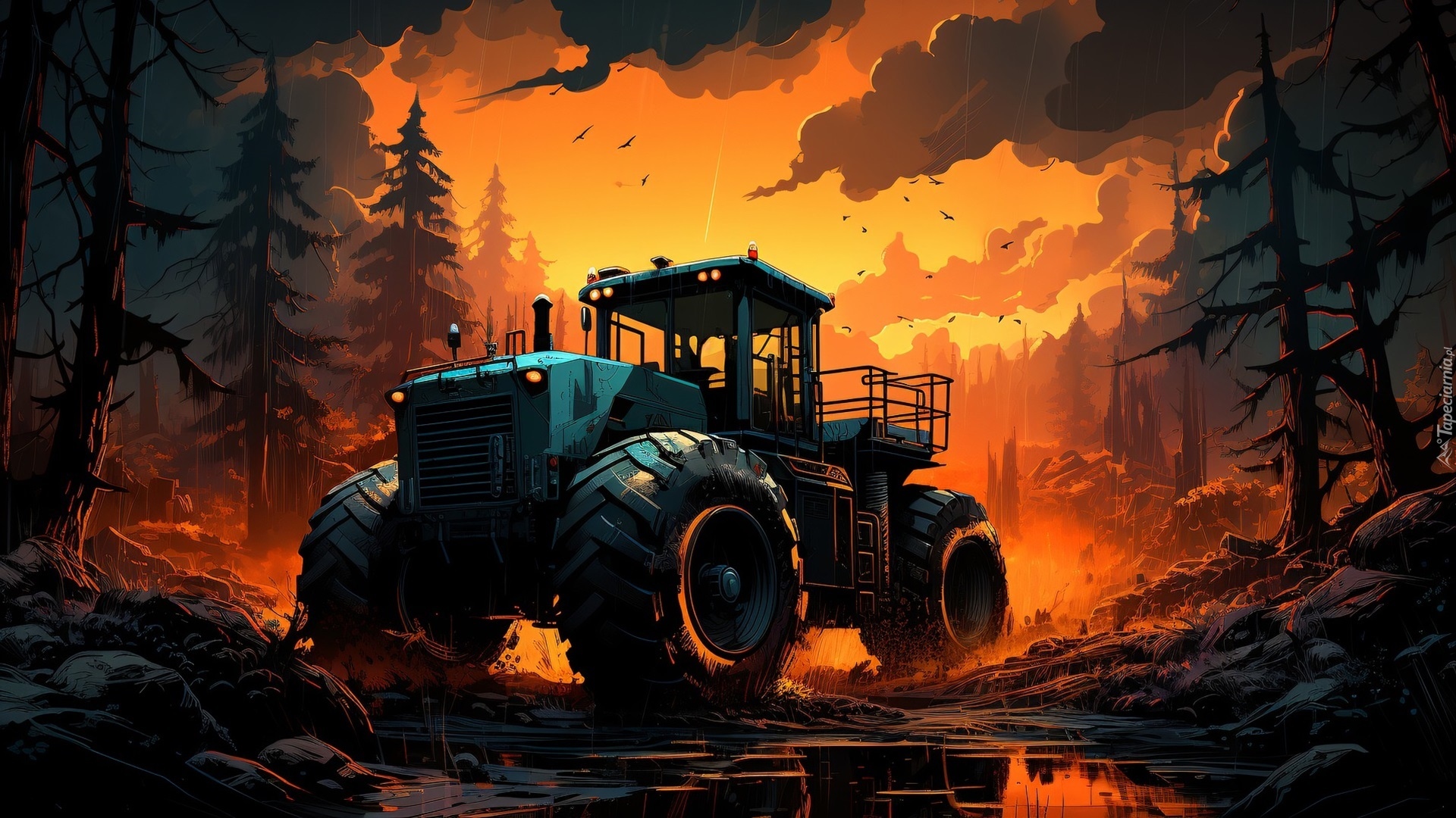 Edytor tapety: Traktor na mokradłach w lesie o zachodzie słońca