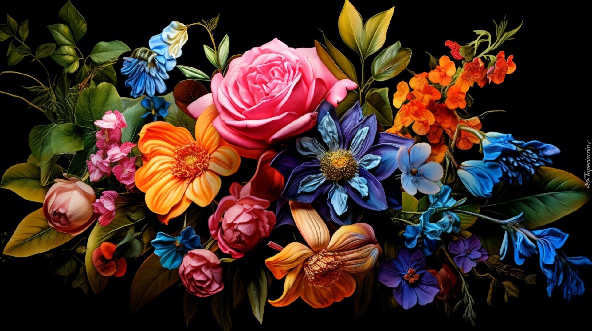 Edytor tapety: Kolorowe rozświetlone kwiaty na czarnym tle