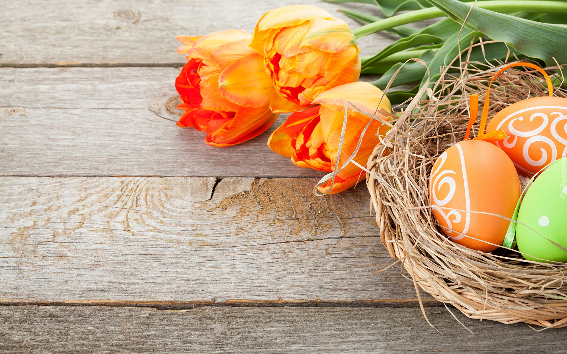 Edytor tapety: Pisanki w gniazdku i tulipany na deskach